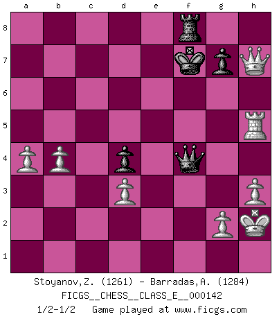 Last move : 1/2-1/2 2011 September 21 7:52:53 [Event "FICGS__CHESS__CLASS_E__000142"] [Site "FICGS"] [Date "2011.09.14"] [Round "1"] [White "Stoyanov,Zdravko"] [Black "Barradas,Anderson"] [Result "1/2-1/2"] [WhiteElo "1261"] [BlackElo "1284"] 1.e4 c5 2.Nf3 e6 3.h3 a6 4.d3 Nc6 5.Nbd2 Nf6 6.Be2 d6 7.O-O Nd4 8.Nxd4 cxd4 9.Nf3 e5 10.Bg5 h6 11.Bh4 Be7 12.a3 Nh7 13.Bxe7 Qxe7 14.Re1 Ng5 15.Nxg5 Qxg5 16.Bg4 O-O 17.c3 f5 18.exf5 Bxf5 19.cxd4 Bxg4 20.Qxg4 Qd2 21.Qe6+ Kh8 22.Qxd6 Qxf2+ 23.Kh1 exd4 24.b4 Rad8 25.Qb6 Rc8 26.Qxb7 Rc2 27.Qe4 Rf3 28.Qg6 Rf8 29.Re4 Rd2 30.Rae1 Qf7 31.Qxa6 Qa2 32.Qg6 Rdf2 33.Rg4 Qf7 34.Qe4 h5 35.Rg5 Qf6 36.Rxh5+ Kg8 37.Qh7+ Kf7 38.a4 Rf1+ 39.Rxf1 Qxf1+ 40.Kh2 Qf4+ 41.Kh1 Qf1+ 42.Kh2 Qf4+ 1/2-1/2 Sicilian defense Kingside Castling by player White (move 7) Kingside Castling by player Black (move 16) This chess game ended in a draw. Follow this game move after move (download)I'd rather have a Pawn than a finger. (Reuben Fine) Nie in meinem Leben habe ich die französische Verteidigung gespielt, welche die Stumpfsinnigste von allen ist. (Wilhelm Steinitz) Cualquier cambio de material en una posición debe venir por medio de un mate, una captura o promoción de Peón. (Purdy) Avec des compensations pour le matériel en plus... (Anonyme) A person who never made a mistake never tried anything new. (Albert Einstein)