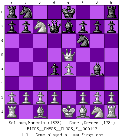 Last move : 1-0 2011 September 20 11:7:22 [Event "FICGS__CHESS__CLASS_E__000142"] [Site "FICGS"] [Date "2011.09.14"] [Round "1"] [White "Salinas,Marcelo"] [Black "Gonet,Gerard"] [Result "1-0"] [WhiteElo "1328"] [BlackElo "1224"] 1.e3 e5 2.Qf3 d5 3.e4 Nf6 4.Nc3 Bg4 5.Qg3 d4 6.Nd5 Qd7 7.Qxe5+ Be7 8.Nxc7+ 1-0 Van't Kruijs Opening Player White won this chess game. Follow this game move after move (download)I give 98 percent of my mental energy to Chess. Others give only 2 percent. (Bobby Fischer) Gegen einen Schachcomputer zu verlieren ist wie Löcher in den Strümpfen zuhaben. Es ist nicht peinlich, solange man der einzige ist der es weiß. (Anonymous) Diferente gente reacciona diferentemente en aceptar la derrota. (Bobby Fischer) Les erreurs sont comme les malheurs, elles n'arrivent jamais seules. (Siegbert Tarrasch) Hello Thibault, if I have had a plan (and I had one, I hope), I have forgotten it during the last week... - Hello Heinz-Georg. What do you mean a plan ? (Anonymous players, during a Big Chess game)