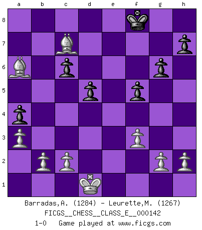 Last move : 1-0 2011 September 16 17:48:13 [Event "FICGS__CHESS__CLASS_E__000142"] [Site "FICGS"] [Date "2011.09.14"] [Round "1"] [White "Barradas,Anderson"] [Black "Leurette,Marc-Antoine"] [Result "1-0"] [WhiteElo "1284"] [BlackElo "1267"] 1.e4 e5 2.Nf3 Nc6 3.d4 exd4 4.Nxd4 Nf6 5.Nc3 Bb4 6.Nxc6 bxc6 7.Bd2 Qe7 8.Qe2 d6 9.O-O-O O-O 10.a3 Bxc3 11.Bxc3 a5 12.f3 a4 13.e5 Ba6 14.exf6 Bxe2 15.fxe7 Bxd1 16.exf8Q+ Kxf8 17.Kxd1 d5 18.Bb4+ Kg8 19.Bd3 g6 20.Re1 Rd8 21.Ba5 Rc8 22.Re7 Kf8 23.Rxc7 Rxc7 24.Bxc7 f5 25.Ba6 1-0 Scotch : Schmidt variation Queenside Castling by player White (move 9) Kingside Castling by player Black (move 9) Promotion Queen by player White (move 16) Player White won this chess game. Follow this game move after move (download)Don't even mention losing to me. I can't stand to think of it. (Bobby Fischer) Auf jeden Fall musst du zuerst Rechtsanwalt werden, damit du deine eigenen Interessen und die deiner Familie vertreten kannst. [Brief an seinen Sohn] (José Raúl Capablanca) Creo que una cierta cantidad de temperamento es esperada de los genios del Ajedrez. (Ron Gross) Les Echecs représentent une sphère d'idées créatrices basée sur la volonté des deux protagonistes. (Smyslov) He who defends everything defends nothing. (Frederick the Great)