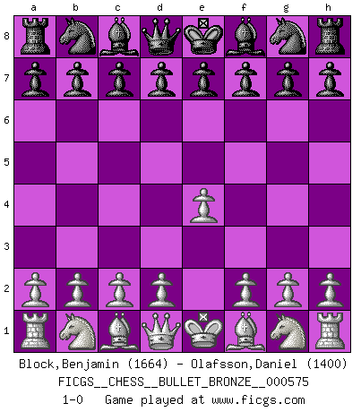 Last move : 1-0 2011 September 14 19:49:30 [Event "FICGS__CHESS__BULLET_BRONZE__000575"] [Site "FICGS"] [Date "2011.09.14"] [Round "1"] [White "Block,Benjamin"] [Black "Olafsson,Daniel"] [Result "1-0"] [WhiteElo "1664"] [BlackElo "1400"] 1.e4 1-0 This chess game has been lost on time (started : 2011.09.14 19:35:10) King's pawn Opening Player White won this chess game. Follow this game move after move (download)We don't really know how the game was invented, though there are suspicions. As soon as we discover the culprits, we'll let you know. (Bruce Pandolfini) Ich brauche nur einen Blick auf das Schachbrett zu werfen, und weiß schon, was in der Stellung steckt, was geschehen kann und was geschehen wird. Alle übrigen suchen und prüfen, ich aber weiß es! (José Raúl Capablanca) Una partida de Ajedrez se divide en 3 etapas: la primera cuando piensas que tienes la ventaja, la segunda cuando crees que tienes la ventaja y la tercera... ¡cuando te das cuenta que vas a perder!. (Savielly Tartakower) Botvinnik disait en comparant les échecs à la musique: Il existe une science dont le but est l'étude de l'acoustique et des sons. Mais il y a aussi un art qui se sert de l'océan des sons : c'est la musique. De toute évidence, il en est de même pour la pensée. La logique est l'étude des lois de la réflexion et les échecs reflètent, en tant qu'art, le côté logique de la réflexion, sous la forme d'images artistiques... Extrait de Fischer - Spassky, Reykjavik 1972 par Alexander & F. Wyndham (Ed. Solar), p 37. Experience is the name we all give to our mistakes. (Oscar Wilde)