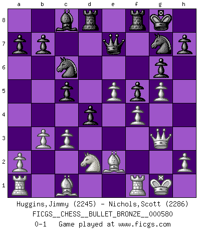 Last move : 0-1 2011 September 16 19:12:6 [Event "FICGS__CHESS__BULLET_BRONZE__000580"] [Site "FICGS"] [Date "2011.09.16"] [Round "1"] [White "Huggins,Jimmy"] [Black "Nichols,Scott"] [Result "0-1"] [WhiteElo "2245"] [BlackElo "2286"] 1.e4 e5 2.Nf3 Nf6 3.d4 Nxe4 4.Bd3 d5 5.dxe5 Be7 6.O-O Nc5 7.Be2 Ne6 8.c3 c6 9.Nd4 O-O 10.Qc2 c5 11.Nf5 Nc6 12.Nxe7+ Qxe7 13.f4 g6 14.Nd2 Ng7 15.Qd3 Be6 16.b3 Rad8 17.Qf3 Bf5 18.g4 Bc8 19.Qg3 f5 20.g5 d4 0-1 Petrov : Modern attack, Symmetrical variation Kingside Castling by player White (move 6) Kingside Castling by player Black (move 9) Player Black won this chess game. Follow this game move after move (download)The passed pawn is a criminal, who should be kept under lock and key. Mild measures, such as police surveillance, are not sufficient. (Nimzovitch) Ich habe kein Problem mit Frauen, sondern nur mit dem Niveau ihres Schachspiels (Judith Polgar) Fischer sacrificó virtualmente todo lo que la mayoría de nosotros los 'debiles' (término que él usa) valoramos, respetamos y apreciamos por el amor de un astuto, a menudo hermoso tablero de juego, por el privilegio ambivalente de ser su mas grande maestro. (Paul Kollar) Shah mat. Le roi est mort. Cri de fierté d'un joueur venant de terrasser son adversaire, courtoisement, sans effusion de sang. Knowledge rests not upon truth alone, but upon error also. (Carl G. Jung)