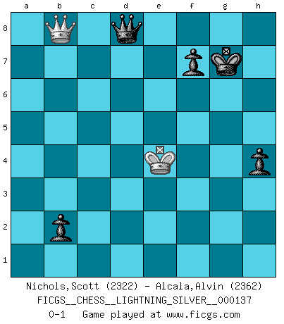 Last move : 0-1 2011 September 16 20:52:14 [Event "FICGS__CHESS__LIGHTNING_SILVER__000137"] [Site "FICGS"] [Date "2011.09.16"] [Round "1"] [White "Nichols,Scott"] [Black "Alcala,Alvin"] [Result "0-1"] [WhiteElo "2322"] [BlackElo "2362"] 1.e4 c5 2.d4 cxd4 3.c3 dxc3 4.Nxc3 Nc6 5.Nf3 d6 6.Bc4 a6 7.O-O Nf6 8.Bf4 e6 9.Qe2 Be7 10.Rfd1 Qc7 11.Rac1 O-O 12.Bb3 Nh5 13.Bd2 Bd7 14.h3 Rfe8 15.g4 Nf6 16.g5 Nh5 17.Nh2 g6 18.Ng4 Qd8 19.Qe3 Bf8 20.Na4 b5 21.Nb6 Rb8 22.Nxd7 Qxd7 23.Bc3 Rec8 24.Kg2 Qb7 25.f3 a5 26.a3 b4 27.axb4 axb4 28.Nf6+ Kh8 29.Be1 Nxf6 30.gxf6 Na5 31.Bg3 Nxb3 32.Qxb3 Qa6 33.Bf4 Kg8 34.h4 e5 35.Bg5 d5 36.exd5 e4 37.Kg3 Rxc1 38.Rxc1 exf3 39.Qxf3 Re8 40.Rc2 h6 41.Bc1 Re1 42.Rc6 Qa7 43.Bd2 Rg1+ 44.Kh2 Rb1 45.Bc1 Bd6+ 46.Kh3 Qg1 47.Rxd6 Rxc1 48.Rd8+ Kh7 49.h5 Rc2 50.hxg6+ Qxg6 51.Re8 Rxb2 52.Re2 Rxe2 53.Qxe2 Qf5+ 54.Kh2 Kg6 55.Qd1 Qf4+ 56.Kg2 Qd6 57.Kf3 h5 58.Ke4 Qxf6 59.Qg1+ Kh6 60.Qc5 Kg7 61.d6 b3 62.Qg1+ Kf8 63.Qb6 b2 64.Qb8+ Kg7 65.d7 h4 66.d8Q Qxd8 0-1 Sicilian : Smith-Morra gambit Kingside Castling by player White (move 7) Kingside Castling by player Black (move 11) 10 pieces endgame at move 52 : White KQPP , Black KQRPPP WHITE : King + 1 Queen 2 Pawns BLACK : King + 1 Queen 1 Rook 3 Pawns 9 pieces endgame at move 53 : White KQPP , Black KQPPP WHITE : King + 1 Queen 2 Pawns BLACK : King + 1 Queen 3 Pawns 8 pieces endgame at move 58 : White KQP , Black KQPPP WHITE : King + 1 Queen 1 Pawn BLACK : King + 1 Queen 3 Pawns Promotion Queen by player White (move 66) 7 pieces endgame at move 66 : White KQ , Black KQPPP WHITE : King + 1 Queen BLACK : King + 1 Queen 3 Pawns Player Black won this chess game. Follow this game move after move (download)I guess a certain amount of temperament is expected of Chess geniuses. (Ron Gross) Das Schachspiel übertrifft alle anderen Spiele so weit wie der Chimborasso einen Misthaufen. (Arthur Schopenhauer) Me dio la sensación de como si yo estuviera jugando en contra del mismo Ajedrez. - al estar jugando en contra de Robert Fischer (Walter Shipman) J'apprécie les joueurs d'est-indienne, c'est grâce à eux que je nourris ma famille depuis tant d'années. (Petrosian) Man is reluctant to give credit for intelligence to anyone, except his enemies. (Albert Einstein)