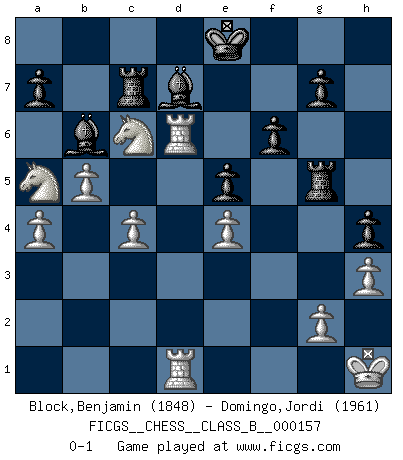 Last move : 0-1 2012 August 27 15:40:0 [Event "FICGS__CHESS__CLASS_B__000157"] [Site "FICGS"] [Date "2011.09.18"] [Round "1"] [White "Block,Benjamin"] [Black "Domingo,Jordi"] [Result "0-1"] [WhiteElo "1848"] [BlackElo "1961"] 1.e4 h6 2.d4 c5 3.dxc5 e6 4.Be3 Na6 5.Bxa6 bxa6 6.Nf3 Qc7 7.Qd4 Nf6 8.O-O Ng4 9.b4 a5 10.a3 f6 11.Nbd2 Nxe3 12.fxe3 d6 13.cxd6 Qxd6 14.Qxd6 Bxd6 15.Nc4 Bc7 16.Nd4 Bd7 17.Nxa5 e5 18.Ndc6 Bb6 19.c4 Bxe3+ 20.Kh1 Rc8 21.b5 h5 22.a4 h4 23.h3 Rc7 24.Rad1 Bb6 25.Rd6 Rh5 26.Rfd1 Rg5 0-1 This chess game has been lost on time (started : 2011.09.18 19:48:17) Carr's defense Kingside Castling by player White (move 8) Player Black won this chess game. Follow this game move after move (download)Castle early and often. (Rob Sillars) Der Schachmeister von Heute braucht Courage, einen Killerinstinkt, Ausdauer und Arroganz. (Larry Evans) De todos mis libros Rusos, la defensa contiene y difunde el 'calor' mas grande que pudiese verse extraño al observar lo supremamente abstracto que el Ajedrez supuestamente es. (Vladimir Nabokov) RxDa4 pat (...) All the troubles of the world come from being unable to sit alone in a quiet room. (Blaise Pascal)
