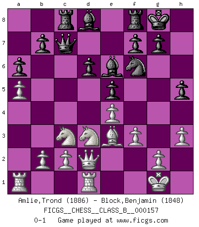 Last move : 0-1 2012 March 23 9:16:45 [Event "FICGS__CHESS__CLASS_B__000157"] [Site "FICGS"] [Date "2011.09.18"] [Round "1"] [White "Amlie,Trond"] [Black "Block,Benjamin"] [Result "0-1"] [WhiteElo "1886"] [BlackElo "1848"] 1.e4 c5 2.Nf3 d6 3.d4 cxd4 4.Nxd4 Nf6 5.Nc3 a6 6.Be3 e5 7.Nb3 Be6 8.Qd2 Nbd7 9.f3 h5 10.a4 Rc8 11.Be2 Nb6 12.a5 Nc4 13.Bxc4 Rxc4 14.O-O Rc8 15.Rfd1 Be7 16.Nc1 O-O 17.h3 Qc7 18.Nd3 Bd8 0-1 This chess game has been lost on time (started : 2011.09.18 19:48:17) Sicilian : Najdorf, Byrne (English) attack Kingside Castling by player White (move 14) Kingside Castling by player Black (move 16) Player Black won this chess game. Follow this game move after move (download)With or without the title, Bobby Fischer was unquestionably the greatest player of his time. (Burt Hochberg) Man braucht nicht immer den besten Zug zu spielen: Ein Zug muß aktiv, unternehmungslustig, korrekt und schön sein. (David Bronstein) ¿Esta Bobby Fischer algo cuerdo?. (Salo Flohr) Toutes les manuvres exécutées sur une colonne ouverte ont pour but ultime l'intrusion définitive sur la septième ou la huitième rangée, en plein cur de la position ennemie. (Aaron Nimzovitch) The greatest con, that he ever pulled... was making you believe... that he is you. (Revolver, movie)