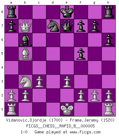Last move : 1-0 2006 May 13 1:45:0 [Event "FICGS__CHESS__RAPID_B__000005"] [Site "FICGS"] [Date "2006.05.10"] [Round "1"] [White "Vidanovic,Djordje"] [Black "Frame,Jeremy"] [Result "1-0"] [WhiteElo "1700"] [BlackElo "1520"] 1.d4 d5 2.Nf3 Nf6 3.Bg5 Bf5 4.c3 Nbd7 5.e3 e6 6.Nbd2 c5 7.Nh4 h6 8.Bxf6 Nxf6 9.Bb5+ Nd7 10.Nxf5 exf5 11.dxc5 Bxc5 12.Nb3 Bb6 13.Qxd5 Qe7 14.Qxb7 1-0 Torre attack (Tartakower variation) Player White won this chess game. Follow this game move after move (download)If your opponent offers you a draw, try to work out why he thinks he's worse off. (Nigel Short) Ich habe die Schachforschung dermaßen betrieben, dass sie auf eine wissenschaftliche Basis gestellt wurde. (Mikhail Moiseyevich Botvinik) Solo el jugador con la iniciativa tiene el derecho a atacar. (Wilhelm Steinitz) J'ai vu le vaincu d'Echecs jouer des années durant dans l'espoir de la fête de la victoire. Car tu es plus riche de ce qu'elle existe si même elle n'est point pour toi. Ainsi de la perle du fond des mers. (Antoine de Saint-Exupéry) The real danger is not that computers will begin to think like men, but that men will begin to think like computers. (Sydney J. Harris)
