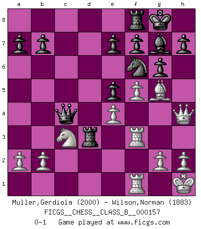 Last move : 0-1 2012 January 20 18:20:11 [Event "FICGS__CHESS__CLASS_B__000157"] [Site "FICGS"] [Date "2011.09.18"] [Round "1"] [White "Muller,Gerdiola"] [Black "Wilson,Norman"] [Result "0-1"] [WhiteElo "2000"] [BlackElo "1883"] 1.e4 c5 2.Nc3 d6 3.f4 g6 4.Nf3 Bg7 5.Bb5+ Bd7 6.O-O Bxb5 7.Nxb5 Nc6 8.d3 Nf6 9.Qe1 O-O 10.Qh4 c4 11.Nc3 Qb6+ 12.Kh1 cxd3 13.cxd3 Rad8 14.f5 Ne5 15.Nxe5 dxe5 16.Qg3 Qd4 17.Bg5 Qxd3 18.Rf3 Qd4 19.Qh4 Qc4 20.Raf1 Rd3 0-1 Sicilian : Closed Kingside Castling by player White (move 6) Kingside Castling by player Black (move 9) Player Black won this chess game. Follow this game move after move (download)If one piece is badly posted, the whole game is bad. (Tarrasch) Sie bekommen vielleicht den Eindruck, dass die Spitzenspieler überhaupt gar nicht so stark sind. Aber das stimmt nicht. Es ist eine Illusion. Mit einem Computer an der Seite ist es sehr leicht, Urteile zu fällen, aber wenn man alleine am Brett sitzt, sieht die Sache ganz anders aus. (Vladimir Kramnik) Solo existe una cosa que Fischer hace en el Ajedrez sin placer: ¡perder!. (Boris Spassky) Je fais ceci parce que dans cinquante coups j'obtiendrai cela; je m'appelle Mikhail Moisevitch Botvinnik. (Botvinnik) Plans are ideas that never come to fruition. (Daniel Parmet)