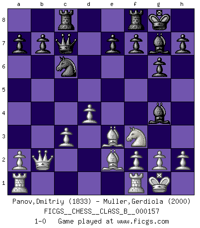 Last move : 1-0 2012 January 12 5:51:20 [Event "FICGS__CHESS__CLASS_B__000157"] [Site "FICGS"] [Date "2011.09.18"] [Round "1"] [White "Panov,Dmitriy"] [Black "Muller,Gerdiola"] [Result "1-0"] [WhiteElo "1833"] [BlackElo "2000"] 1.e4 c5 2.c3 g6 3.d4 cxd4 4.cxd4 d5 5.exd5 Nf6 6.Nc3 Nxd5 7.Bc4 Nxc3 8.bxc3 Bg7 9.Nf3 O-O 10.O-O Qc7 11.Qb3 Nc6 12.Qb2 Bg4 13.Be2 Rac8 14.Be3 1-0 This chess game has been lost on time (started : 2011.09.18 19:48:17) Sicilian : Alapin's variation (2.c3) Kingside Castling by player Black (move 9) Kingside Castling by player White (move 10) Player White won this chess game. Follow this game move after move (download)Chess is everything: art, science and sport. (Anatoly Karpov) Ich liebe den Moment, wenn ich das Ego meines Gegenüber breche. (Robert James Fischer) El Ajedrez es una guerra en un tablero. El objetivo es aplastar la mente del oponente. (Bobby Fischer) A chaque perte on perd un peu de soi. (Joël Lautier) I know the human being and fish can coexist peacefully. (George W. Bush, Saginaw sept. 29, 2000)