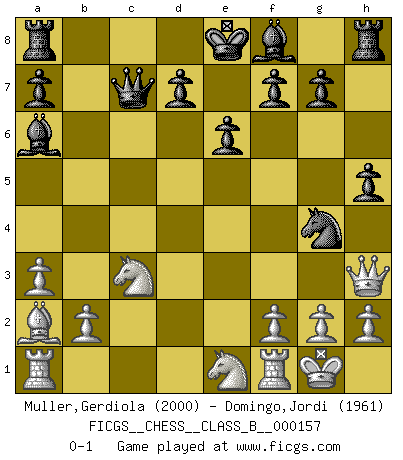 Last move : 0-1 2011 December 22 16:56:44 [Event "FICGS__CHESS__CLASS_B__000157"] [Site "FICGS"] [Date "2011.09.18"] [Round "1"] [White "Muller,Gerdiola"] [Black "Domingo,Jordi"] [Result "0-1"] [WhiteElo "2000"] [BlackElo "1961"] 1.e4 h6 2.d4 c5 3.dxc5 e6 4.Be3 Nf6 5.e5 Nd5 6.Bd4 Nc6 7.c3 Nxd4 8.cxd4 b6 9.Bc4 Bb7 10.Nf3 bxc5 11.O-O cxd4 12.Qxd4 Nb4 13.Ne1 Qc7 14.a3 Nc6 15.Qe3 Nxe5 16.Ba2 Ng4 17.Qh3 h5 18.Nc3 Ba6 0-1 This chess game has been lost on time (started : 2011.09.18 19:48:17) Carr's defense Kingside Castling by player White (move 11) Player Black won this chess game. Follow this game move after move (download)Good positions don't win games, good moves do. (Gerald Abrahams) Modernes Schach erfordert enorme Anspannung. Es ist für einen normalen Menschen unmöglich das auszuhalten. (Viktor Kortschnoi) El juego de Damas es para vagabundos. (Paul Morphy) Je crois qu'il existe des manières très spécifiques de jouer efficacement contre une machine. Evidemment, nous n'avons aucune chance en technique pure, parce que l'ordinateur calcule de manière parfaite. Mais lorsque nous faisons appel à notre cerveau, en utilisant l'intuition et la compréhension, alors nous restons beaucoup plus forts. (Anatoli Karpov) Success without honor is an unseasoned dish; it will satisfy your hunger, but it won't taste good. (Joe Paterno)