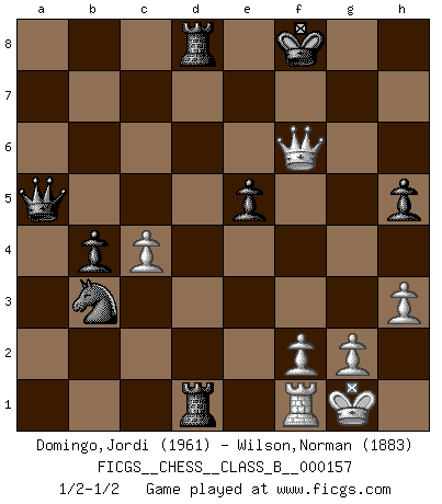 Last move : 1/2-1/2 2011 December 11 20:25:45 [Event "FICGS__CHESS__CLASS_B__000157"] [Site "FICGS"] [Date "2011.09.18"] [Round "1"] [White "Domingo,Jordi"] [Black "Wilson,Norman"] [Result "1/2-1/2"] [WhiteElo "1961"] [BlackElo "1883"] 1.e4 c5 2.Nf3 Nc6 3.d4 cxd4 4.Nxd4 Nf6 5.Nc3 e5 6.Ndb5 d6 7.Bg5 a6 8.Na3 b5 9.Nd5 Be7 10.Bxf6 Bxf6 11.c4 b4 12.Nc2 a5 13.Be2 O-O 14.O-O Bg5 15.Qd3 Be6 16.Rad1 g6 17.b3 Kg7 18.h3 Kg8 19.Bg4 Kg7 20.Nde3 Be7 21.Nd5 Bg5 22.Nce3 h5 23.Be2 a4 24.Nc2 Qa5 25.Nde3 axb3 26.axb3 Rfc8 27.Qxd6 Bxe3 28.Nxe3 Nd4 29.Bd3 Rd8 30.Qe7 Ra7 31.Qh4 Nxb3 32.Nf5+ Bxf5 33.exf5 Rad7 34.fxg6 Rxd3 35.gxf7 Rxd1 36.f8Q+ Kxf8 37.Qf6+ 1/2-1/2 Sicilian : Pelikan (Lasker/Sveshnikov) variation Kingside Castling by player Black (move 13) Kingside Castling by player White (move 14) Promotion Queen by player White (move 36) This chess game ended in a draw. Follow this game move after move (download)All that matters on the Chessboard is good moves. (Bobby Fischer) Ich tröste mich mit dem Vergnügen, daß Schachfans, Zuschauer und Leser glücklich sind, wenn ein Großmeister etwas riskiert, statt nur Klötzchen zu schieben. (Mikhail Nekhemyevich Tal) Solo puedes ser bueno en el Ajedrez si amas al juego. (Bobby Fischer) C'est une question de caractère, Beaucoup de gens perdent leur motivation très vite. D'autres, ils sont rares, peuvent la conserver très longtemps. J'aime les échecs, encore aujourd'hui je suis heureux d'analyser des parties. J'aime toujours gagner, je déteste encore perdre. Bien jouer est important pour mon intégrité intellectuelle et morale. Et puis les échecs vivent en ce moment une période historique grâce à Internet. Ils se développent dans les systèmes éducatifs à travers le monde. Ils sortent de leur ghetto, et c'est mon rôle de mener à bien cette révolution. (Gary Kasparov) Perception is reality. (Immanuel Kant)