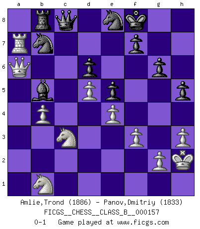 Last move : 0-1 2012 May 24 14:5:45 [Event "FICGS__CHESS__CLASS_B__000157"] [Site "FICGS"] [Date "2011.09.18"] [Round "1"] [White "Amlie,Trond"] [Black "Panov,Dmitriy"] [Result "0-1"] [WhiteElo "1886"] [BlackElo "1833"] 1.e4 e5 2.Nf3 Nc6 3.Bb5 a6 4.Ba4 Nf6 5.O-O Be7 6.Re1 b5 7.Bb3 d6 8.c3 O-O 9.h3 Na5 10.Bc2 c5 11.d4 Qc7 12.d5 c4 13.b4 cxb3 14.axb3 g6 15.Bh6 Re8 16.Bd3 Bd7 17.Re2 Nb7 18.b4 Reb8 19.Rea2 a5 20.Qe2 Qd8 21.Na3 axb4 22.cxb4 Ra4 23.Qb2 Qe8 24.Nb1 Bf8 25.Bxf8 Kxf8 26.Nc3 Rxa2 27.Rxa2 Qc8 28.Nd2 Qc7 29.Ra6 Nd8 30.Ndb1 Bc8 31.Ra5 Nb7 32.Ra7 Bd7 33.Qa3 Qc8 34.Qa1 Qd8 35.Qa6 Qc8 36.f3 h5 37.Kh2 Ne8 38.Bxb5 Bxb5 0-1 Ruy Lopez : Closed Kingside Castling by player White (move 5) Kingside Castling by player Black (move 8) Player Black won this chess game. Follow this game move after move (download)I look one move ahead... the best ! (Siegbert Tarrasch) Sicherlich können nur Meister einen Stil haben. Daß ein nicht-Meister auch nur ein einziges Mal in seinem Leben eine Partie folgerecht durchführte, habe ich niemals bemerkt. (Emanuel Lasker) Repentinamente, me resultaba obvio en mi analisis que yo había pasado por alto lo que Fischer había visto en el tablero con la mas grande facilidad. (Mikhail Botvinnik) On est toujours la mazette de quelqu'un d'autre. (Anonyme) There are two kinds of people in the world, my friend. Those who have a loaded gun and those who dig. You dig ! (Blondie in The Good, The Bad and The Ugly)