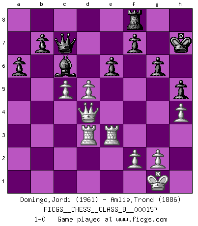 Last move : 1-0 2012 May 23 1:57:42 [Event "FICGS__CHESS__CLASS_B__000157"] [Site "FICGS"] [Date "2011.09.18"] [Round "1"] [White "Domingo,Jordi"] [Black "Amlie,Trond"] [Result "1-0"] [WhiteElo "1961"] [BlackElo "1886"] 1.e4 c5 2.Nf3 d6 3.c3 Nf6 4.Be2 g6 5.O-O Bg7 6.Bb5+ Nc6 7.d4 Bd7 8.Qe2 cxd4 9.cxd4 a6 10.Bxc6 Bxc6 11.Nc3 d5 12.e5 Ne4 13.Ne1 Nxc3 14.bxc3 Bb5 15.Nd3 Qd7 16.Qf3 Rc8 17.a4 Bxa4 18.Nc5 Rxc5 19.dxc5 O-O 20.Re1 Bb5 21.Be3 Bxe5 22.Bh6 Bg7 23.Bxg7 Kxg7 24.Rad1 e6 25.c4 Bc6 26.Qc3+ Kg8 27.h4 Qd8 28.Qd4 h5 29.Re3 Kh7 30.R1d3 Qc7 31.cxd5 1-0 Sicilian Kingside Castling by player White (move 5) Kingside Castling by player Black (move 19) Player White won this chess game. Follow this game move after move (download)Before the endgame, the Gods have placed the middle game. (Siegbert Tarrasch) Die jungen Leute sollen verstehen, dass sie noch etwas von mir lernen können und müssen. (Viktor Kortschnoi) Una partida de Ajedrez se divide en 3 etapas: la primera cuando piensas que tienes la ventaja, la segunda cuando crees que tienes la ventaja y la tercera... ¡cuando te das cuenta que vas a perder!. (Savielly Tartakower) Les pièces de l'échiquier étaient impitoyables. Elles le retenaient, elles l'absorbaient. Il y avait de l'horreur en cela, mais aussi une harmonie unique. Car, qu'y a-t-il dans le monde, à part les échecs ? (V. Nabokov) The quality of decision is like the well-timed swoop of a falcon which enables it to strike and destroy its victim. (Sun Tzu)