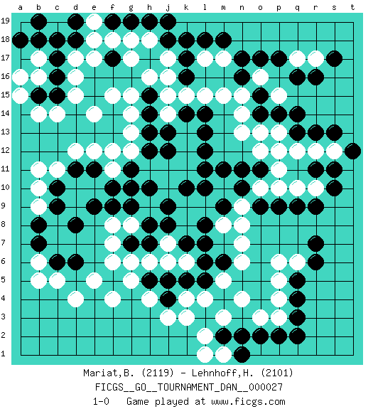Last move : 1-0 2012 June 10 23:40:39 [Event "FICGS__GO__TOURNAMENT_DAN__000027"] [Site "FICGS"] [Date "2011.09.18"] [Round "1"] [Black "Mariat,Benoit"] [White "Lehnhoff,Heinz-Georg"] [Result "1-0"] [Rating 1 "2119"] [Rating 2 "2101"] 1.q16 d4 2.q3 d16 3.r9 n4 4.q5 k4 5.f17 c14 6.k16 r17 7.r16 q17 8.p17 j16 9.k17 j17 10.s17 f15 11.c17 d17 12.d18 e18 13.c18 e17 14.b15 b14 15.c15 d15 16.c16 n15 17.n17 o16 18.o17 k15 19.j18 h18 20.k18 g17 21.c9 c11 22.c6 c5 23.d6 f4 24.e9 b6 25.b7 b5 26.p9 l15 27.e11 f6 28.d8 p12 29.r13 e14 30.n2 l2 31.q2 r12 32.q13 q12 33.s13 n9 34.o11 o13 35.m11 n7 36.h8 j11 37.h10 p10 38.o9 o10 39.n10 p11 40.m9 n8 41.k10 j10 42.j9 h6 43.k7 k11 44.l10 a15 45.a18 p6 46.r7 h11 47.g10 f12 48.l3 k3 49.m2 m3 50.l5 l4 51.j5 h4 52.g11 g12 53.l12 p4 54.q4 p3 55.p2 a16 56.b19 b17 57.d19 b16 58.b18 b10 59.s11 s12 60.t12 e12 61.j13 k13 62.l13 k12 63.l14 m15 64.k14 j14 65.h14 j15 66.h12 p5 67.d11 d12 68.c10 m17 69.m18 l17 70.l18 g13 71.h13 g14 72.h15 q6 73.r6 b9 74.b8 b11 75.j4 j3 76.k5 q10 77.q9 m5 78.l7 e5 79.m6 n6 80.h5 g5 81.g7 g6 82.r11 f7 83.o15 p15 84.o14 n13 85.p14 n14 86.n16 m8 87.l8 f8 88.f9 h16 89.l11 g8 90.g9 g15 91.j12 r10 92.s10 p13 93.q14 m1 94.n1 l1 95.h7 o3 96.o2 j6 97.f19 e19 98.h19 g18 99.g19 f18 100.j19 j7 101.j8 k6 102.l6 f11 103.f10 o12 104.n11 1-0 Here are the names of the openings (joseki) played in the four corners : Corner d16 : d16 f17 Hoshi (Hwajeom, Seongjeom, Xingwei`) 4-4 Point. The star or hoshi (4-4) point, emphasizing influence at the potential expense of territory. Ikken Kakari (Hankan Keolch'im, Yi Gua`jiao~, 1-Space Low Approach). Black 2 is the standard approach move to the 4-4. Corner q16 : q16 r17 Hoshi (Hwajeom, Seongjeom, Xingwei`) 4-4 Point. The star or hoshi (4-4) point, emphasizing influence at the potential expense of territory. Corner d4 : d4 c9 Hoshi (Hwajeom, Seongjeom, Xingwei`) 4-4 Point. The star or hoshi (4-4) point, emphasizing influence at the potential expense of territory. Player Black won this Go (weiqi, baduk) game. Follow this game move after move (download)The weak player fears ko, the strong player seeks it. (Bill Taylor) Home computers are being called upon to perform many new functions, including the consumption of homework formerly eaten by the dog. (Doug Larson)