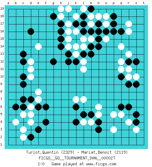 Last move : 1-0 2011 December 14 22:1:9 [Event "FICGS__GO__TOURNAMENT_DAN__000027"] [Site "FICGS"] [Date "2011.09.18"] [Round "1"] [Black "Turlot,Quentin"] [White "Mariat,Benoit"] [Result "1-0"] [Rating 1 "2329"] [Rating 2 "2119"] 1.q16 d4 2.d16 r4 3.r9 o17 4.l17 q14 5.o16 n16 6.n17 r17 7.p17 r16 8.r12 r13 9.s12 q12 10.r6 p3 11.c6 o18 12.p18 o15 13.p16 m17 14.m16 n18 15.n15 m15 16.n17 r10 17.m14 s10 18.q10 q11 19.s9 r11 20.s4 s3 21.s5 q5 22.f4 d6 23.d7 c5 24.e6 d5 25.c7 e7 26.f6 e8 27.c9 d10 28.c10 d11 29.c12 d12 30.c13 l15 31.n14 l14 32.l16 e14 33.e3 c3 34.d2 b4 35.n3 m4 36.n4 n5 37.m5 l4 38.l5 n6 39.k4 l7 40.k6 k7 41.q6 p5 42.l13 k13 43.k12 j14 44.j12 l12 45.m13 l11 46.h14 j15 47.j13 k14 48.h15 j16 49.h16 j17 50.h17 h18 51.g18 k18 52.g12 m18 53.l18 n16 54.m19 k16 55.n17 h19 56.k19 n16 57.b6 c2 58.n17 j19 59.n16 l19 60.k17 1-0 Here are the names of the openings (joseki) played in the four corners : Corner q4 : r4 r9 Komoku (Somok, Xiao~mu`) 3-4 Point. The komoku (3-4) point is the traditional corner enclosure move.. Corner q16 : q16 o17 Hoshi (Hwajeom, Seongjeom, Xingwei`) 4-4 Point. The star or hoshi (4-4) point, emphasizing influence at the potential expense of territory. Ikken Kakari (Hankan Keolch'im, Yi Gua`jiao~, 1-Space Low Approach). White 2 is the standard approach move to the 4-4. Corner d4 : d4 c6 Hoshi (Hwajeom, Seongjeom, Xingwei`) 4-4 Point. The star or hoshi (4-4) point, emphasizing influence at the potential expense of territory. Ikken Kakari (Hankan Keolch'im, Yi Gua`jiao~, 1-Space Low Approach). Black 2 is the standard approach move to the 4-4. Corner d16 : d16 d11 Hoshi (Hwajeom, Seongjeom, Xingwei`) 4-4 Point. The star or hoshi (4-4) point, emphasizing influence at the potential expense of territory. Player Black won this Go (weiqi, baduk) game. Follow this game move after move (download)The L-group is dead. (Anonymous) We're missing something. (Gregory House, House M.D.)