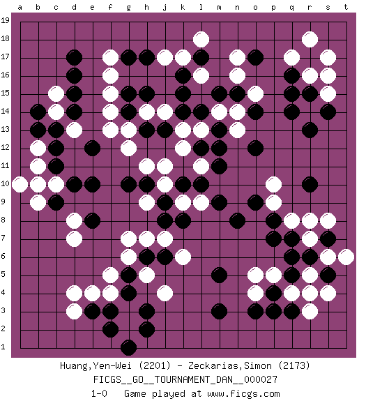 Last move : 1-0 2012 February 20 8:46:1 [Event "FICGS__GO__TOURNAMENT_DAN__000027"] [Site "FICGS"] [Date "2011.09.18"] [Round "1"] [Black "Huang,Yen-Wei"] [White "Zeckarias,Simon"] [Result "1-0"] [Rating 1 "2201"] [Rating 2 "2173"] 1.q16 d4 2.q3 r5 3.d16 o4 4.q5 q4 5.p4 r4 6.p3 p5 7.q6 r3 8.o3 o5 9.m3 r7 10.q7 q8 11.r6 s6 12.s7 r8 13.s5 t6 14.p7 s4 15.p8 p9 16.o9 p10 17.n8 r14 18.o17 c10 19.f3 j4 20.m5 f4 21.g4 f5 22.e3 d3 23.g5 g6 24.h6 g3 25.h3 g2 26.h2 e4 27.f2 h7 28.j6 g7 29.e10 d8 30.c11 b11 31.b10 b9 32.d10 a10 33.c9 b10 34.c12 f17 35.h17 f15 36.h15 f13 37.d17 n16 38.e8 d7 39.e12 c14 40.d14 b12 41.c13 n17 42.q14 r16 43.r15 s15 44.q15 s17 45.r17 s16 46.r13 r18 47.s14 q17 48.r10 s8 49.h13 g12 50.g10 h11 51.h10 j11 52.l14 k17 53.g17 f16 54.k16 l16 55.k15 j17 56.l12 l11 57.m11 k12 58.m12 j14 59.g15 h14 60.g14 g13 61.j13 k13 62.k14 l13 63.m13 m14 64.l10 f14 65.m15 n14 66.n15 o15 67.l17 d13 68.b14 c15 69.d15 l18 70.o14 n13 71.o12 l9 72.k10 j10 73.j9 k9 74.m9 h9 75.j8 j7 76.k8 h5 77.g1 k6 78.b13 1-0 Here are the names of the openings (joseki) played in the four corners : Corner q4 : q3 r5 Komoku (Somok, Xiao~mu`) 3-4 Point. The komoku (3-4) point is the traditional corner enclosure move.. Ikken Kakari (Hankan Keolch'im, Yi Gua`jiao~, 1-Space Low Pincer). The small knight move is the basic approach move to the 3-4 point stone. It has been continually used for over four centuries. There are limitless variations, with new moves constantly being discovered. White 2 opens the door to a treaure store of joseki. Corner q16 : q16 r14 Hoshi (Hwajeom, Seongjeom, Xingwei`) 4-4 Point. The star or hoshi (4-4) point, emphasizing influence at the potential expense of territory. Ikken Kakari (Hankan Keolch'im, Yi Gua`jiao~, 1-Space Low Approach). White 2 is the standard approach move to the 4-4. Corner d4 : d4 f3 Hoshi (Hwajeom, Seongjeom, Xingwei`) 4-4 Point. The star or hoshi (4-4) point, emphasizing influence at the potential expense of territory. Ikken Kakari (Hankan Keolch'im, Yi Gua`jiao~, 1-Space Low Approach). Black 2 is the standard approach move to the 4-4. Player Black won this Go (weiqi, baduk) game. Follow this game move after move (download)Error is one of the sources of transformation. (Pierre Audouard) Waiting for chance ? Play in casinos. (FICGS proverb)