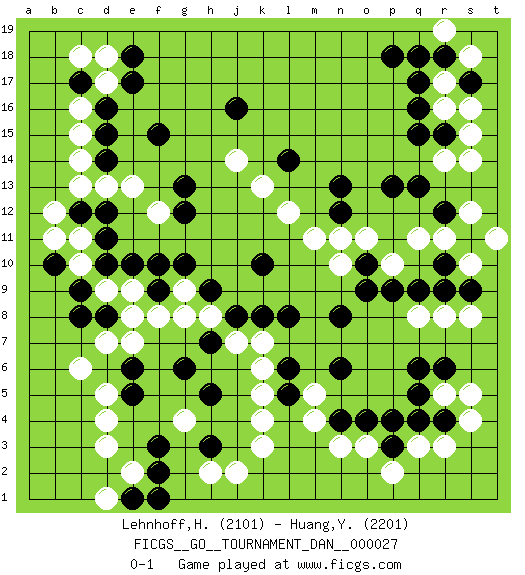 Last move : 0-1 2012 April 29 2:12:41 [Event "FICGS__GO__TOURNAMENT_DAN__000027"] [Site "FICGS"] [Date "2011.09.18"] [Round "1"] [Black "Lehnhoff,Heinz-Georg"] [White "Huang,Yen-Wei"] [Result "0-1"] [Rating 1 "2101"] [Rating 2 "2201"] 1.q16 d17 2.q4 d3 3.d15 c15 4.d14 c14 5.d16 c16 6.e17 d13 7.c17 d18 8.e18 c18 9.j16 e13 10.f15 c6 11.d10 r14 12.r12 r17 13.q17 r16 14.q15 s14 15.p13 o3 16.c8 r3 17.p3 p2 18.c12 c13 19.o4 q3 20.p4 n3 21.r18 s18 22.p18 r19 23.q18 s5 24.r6 r5 25.q6 m5 26.h3 k3 27.f3 d5 28.q9 c11 29.r15 s15 30.h5 c10 31.c9 e7 32.f10 e9 33.e10 d9 34.g6 g8 35.h9 h8 36.j8 g9 37.g10 j7 38.k8 k7 39.l8 j2 40.g13 f12 41.g12 s12 42.s11 r11 43.r10 q11 44.q13 s10 45.s9 t11 46.d12 b12 47.d11 p10 48.n8 n10 49.f9 f8 50.e6 d7 51.h7 k5 52.e5 d4 53.n4 m4 54.o9 e2 55.o10 o11 56.d8 e8 57.s17 s16 58.b10 b11 59.n13 m11 60.n12 n11 61.r4 s4 62.q5 l12 63.k10 k13 64.l14 r8 65.r9 s8 66.n6 q8 67.p9 j14 68.l6 k6 69.l5 k4 70.f2 h2 71.e1 d1 72.f1 g4 0-1 Here are the names of the openings (joseki) played in the four corners : Corner d16 : d17 d15 Komoku (Somok, Xiao~mu`) 3-4 Point. The komoku (3-4) point is the traditional corner enclosure move.. Ikken Takagakari (Hankan Nop'dakeolch'im, Yi Gaogua`jiao~, 1-Space High Approach). The 5-4 approach move has become more popular in modern times, as modern Go emphasizes speed and influence. Corner q16 : q16 r14 Hoshi (Hwajeom, Seongjeom, Xingwei`) 4-4 Point. The star or hoshi (4-4) point, emphasizing influence at the potential expense of territory. Ikken Kakari (Hankan Keolch'im, Yi Gua`jiao~, 1-Space Low Approach). White 2 is the standard approach move to the 4-4. Corner q4 : q4 o3 Hoshi (Hwajeom, Seongjeom, Xingwei`) 4-4 Point. The star or hoshi (4-4) point, emphasizing influence at the potential expense of territory. Ikken Kakari (Hankan Keolch'im, Yi Gua`jiao~, 1-Space Low Approach). White 2 is the standard approach move to the 4-4. Player White won this Go (weiqi, baduk) game. Follow this game move after move (download)Capture what you cut off. (Anonymous) A good book on your shelf is a friend that turns its back on you and remains a friend. (Author unknown)