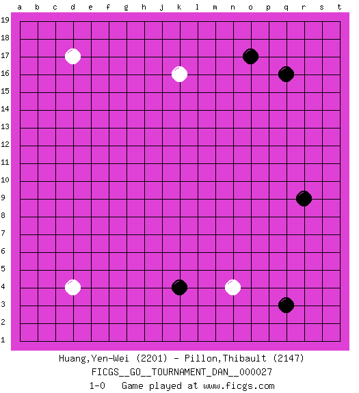 Last move : 1-0 2011 December 13 4:18:48 [Event "FICGS__GO__TOURNAMENT_DAN__000027"] [Site "FICGS"] [Date "2011.09.18"] [Round "1"] [Black "Huang,Yen-Wei"] [White "Pillon,Thibault"] [Result "1-0"] [Rating 1 "2201"] [Rating 2 "2147"] 1.q16 d17 2.q3 d4 3.r9 k16 4.o17 n4 5.k4 1-0 This go game has been lost on time (started : 2011.09.18 21:31:33) Here are the names of the openings (joseki) played in the four corners : Player Black won this Go (weiqi, baduk) game. Follow this game move after move (download)Dead group ? Always win ko fights ! (Anonymous) Players are not good because they find tactics, it is about the way to find the positions in which those tactics are hidden. (Luc-Olivier Leclerc)
