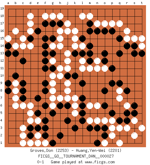 Last move : 0-1 2012 February 21 0:51:7 [Event "FICGS__GO__TOURNAMENT_DAN__000027"] [Site "FICGS"] [Date "2011.09.18"] [Round "1"] [Black "Groves,Don"] [White "Huang,Yen-Wei"] [Result "0-1"] [Rating 1 "2253"] [Rating 2 "2201"] 1.q15 d16 2.q4 d4 3.f4 d6 4.d3 c3 5.e3 c2 6.k3 q17 7.o16 o17 8.n16 r15 9.r14 r16 10.q13 n17 11.m16 r6 12.r8 q8 13.q9 q7 14.p9 o4 15.p5 r3 16.r4 q3 17.o6 p4 18.s3 s2 19.s5 t3 20.s6 c14 21.f17 l18 22.f15 k16 23.f6 d18 24.f13 k14 25.l13 j12 26.f11 l11 27.j10 j11 28.k10 l12 29.k13 j13 30.j14 g12 31.f12 h14 32.j15 g14 33.f14 l14 34.m13 h16 35.c8 b7 36.c12 b8 37.m14 j16 38.c9 h10 39.h9 g10 40.b13 b14 41.m3 m4 42.n3 n4 43.l4 m6 44.a14 a15 45.a13 b16 46.l5 n6 47.o8 s4 48.r5 j8 49.h8 j7 50.l7 j9 51.l9 g7 52.f9 g9 53.f8 g8 54.h6 h7 55.o2 p2 56.o3 p3 57.j6 f1 58.l15 k15 59.m17 m18 60.d2 d1 61.e1 e2 62.f2 e1 63.g1 c1 64.h2 n11 65.o12 e4 66.f3 o11 67.p11 s15 68.s14 t14 69.t13 t15 70.s13 b9 71.b10 g18 72.g17 h18 73.h17 j17 74.e5 d5 75.g15 h15 76.d15 c15 77.c7 c6 78.m12 m11 79.e16 d17 80.p1 q1 81.g13 o1 82.p16 p17 83.g11 h11 84.n1 f18 85.a9 n12 86.o13 k6 87.l6 g6 88.g5 k5 89.j4 k7 90.a8 b6 91.e7 d14 0-1 Here are the names of the openings (joseki) played in the four corners : Corner d4 : d4 f4 Hoshi (Hwajeom, Seongjeom, Xingwei`) 4-4 Point. The star or hoshi (4-4) point, emphasizing influence at the potential expense of territory. Ikken Takagakari (Hankan Nop'dakeolch'im, Yi Gaojia, 1-Space High Approach). White typically responds at 6-4 or 3-10. White 4-10 is played when White finds play on the right side advantageous. White 4-8 or 3-8 may be played when White has support at top. Corner q16 : q15 q17 Takamoku (Gomok, Gaomu`) 5-4 Point. The takamoku (high) point (5-4). With its emphasis on influence, the 5-4 point complements the 4-4 (hoshi) point in creating an influence-oriented fuseki. Komoku. Black responds with 3-3, 3-5, 4-6, 4-7, 3-6, 3-7. Corner q4 : q4 r6 Hoshi (Hwajeom, Seongjeom, Xingwei`) 4-4 Point. The star or hoshi (4-4) point, emphasizing influence at the potential expense of territory. Ikken Kakari (Hankan Keolch'im, Yi Gua`jiao~, 1-Space Low Approach). White 2 is the standard approach move to the 4-4. Player White won this Go (weiqi, baduk) game. Follow this game move after move (download)If you don't know ladders, don't play go. (Anonymous) There are three kinds of lies: lies, damned lies and statistics. (Mark Twain)