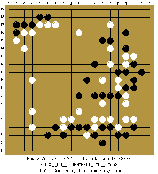 Last move : 1-0 2012 February 26 20:1:19 [Event "FICGS__GO__TOURNAMENT_DAN__000027"] [Site "FICGS"] [Date "2011.09.18"] [Round "1"] [Black "Huang,Yen-Wei"] [White "Turlot,Quentin"] [Result "1-0"] [Rating 1 "2201"] [Rating 2 "2329"] 1.q16 d4 2.q3 d16 3.r9 d10 4.f3 d6 5.k4 o17 6.q14 k16 7.c17 c16 8.d17 e17 9.e18 f17 10.f18 g17 11.b16 b15 12.b17 c14 13.n15 r5 14.r4 q5 15.o4 p9 16.p8 q8 17.q9 q7 18.o8 o5 19.n4 n5 20.m8 m4 21.m3 p4 22.p3 l3 23.l4 m5 24.n2 k6 25.k8 n7 26.n8 j5 27.j4 h4 28.h3 h5 29.g4 p10 30.q11 n10 31.l10 o12 32.m12 q12 33.r12 r11 34.s11 r13 35.r10 q13 36.p11 o14 37.o15 1-0 Here are the names of the openings (joseki) played in the four corners : Corner d4 : d4 f3 Hoshi (Hwajeom, Seongjeom, Xingwei`) 4-4 Point. The star or hoshi (4-4) point, emphasizing influence at the potential expense of territory. Ikken Kakari (Hankan Keolch'im, Yi Gua`jiao~, 1-Space Low Approach). Black 2 is the standard approach move to the 4-4. Corner q16 : q16 o17 Hoshi (Hwajeom, Seongjeom, Xingwei`) 4-4 Point. The star or hoshi (4-4) point, emphasizing influence at the potential expense of territory. Ikken Kakari (Hankan Keolch'im, Yi Gua`jiao~, 1-Space Low Approach). White 2 is the standard approach move to the 4-4. Corner d16 : d16 c17 Hoshi (Hwajeom, Seongjeom, Xingwei`) 4-4 Point. The star or hoshi (4-4) point, emphasizing influence at the potential expense of territory. Player Black won this Go (weiqi, baduk) game. Follow this game move after move (download)When your opponent has two weak groups, attack them both at once. (Anonymous) Now the reason the enlightened prince and the wise general conquer the enemy whenever they move and their achievements surpass those of ordinary men is foreknowledge. (Sun Tzu)