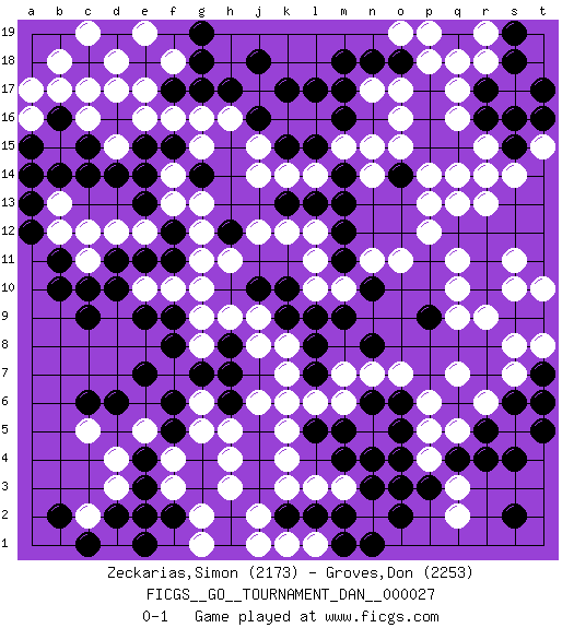 Last move : 0-1 2011 November 25 14:25:31 [Event "FICGS__GO__TOURNAMENT_DAN__000027"] [Site "FICGS"] [Date "2011.09.18"] [Round "1"] [Black "Zeckarias,Simon"] [White "Groves,Don"] [Result "0-1"] [Rating 1 "2173"] [Rating 2 "2253"] 1.r16 d15 2.q4 d4 3.d17 f16 4.l17 q10 5.c9 r13 6.p16 c12 7.c6 c5 8.d6 f4 9.c15 c16 10.d16 c17 11.c18 b18 12.c14 d18 13.e18 c19 14.e15 e17 15.d14 e12 16.g14 j17 17.h12 r6 18.o3 k3 19.s4 s5 20.r5 s7 21.t5 g11 22.j10 g9 23.h7 f7 24.f6 g6 25.g7 j9 26.k9 g8 27.e7 j8 28.f8 k8 29.k10 j15 30.g17 g16 31.h17 h16 32.j18 f18 33.l15 k14 34.f12 g12 35.f11 f13 36.e11 g13 37.e13 d12 38.d11 b13 39.b14 f14 40.b11 h11 41.m13 l12 42.m12 l11 43.r11 q11 44.r12 q13 45.q12 p12 46.r10 r9 47.s13 s14 48.s12 p13 49.s15 p6 50.s6 q7 51.m11 m10 52.n10 o11 53.m9 l10 54.p9 q9 55.n8 l14 56.m14 n11 57.l9 n5 58.n6 m6 59.l7 m7 60.l8 k6 61.l13 k12 62.k13 j12 63.f15 k7 64.f2 c11 65.c10 g5 66.e3 d3 67.d2 b12 68.b10 c2 69.b2 d1 70.e1 e2 71.o5 n7 72.d2 n15 73.c1 n17 74.o14 o15 75.p15 m15 76.k15 j14 77.k17 n14 78.f17 e16 79.j5 j6 80.h6 h5 81.j4 h3 82.o6 o7 83.j3 j2 84.k2 g2 85.l5 l3 86.m4 l6 87.l2 m3 88.e4 k5 89.j16 d15 90.d16 a16 91.a14 p18 92.q18 q17 93.p17 r18 94.q19 r19 95.o18 p19 96.n18 o17 97.m17 r15 98.s16 q16 99.q15 r14 100.r17 q18 101.s18 p14 102.s19 q14 103.t14 f10 104.e9 s10 105.m2 k4 106.n4 p5 107.o4 g15 108.e14 s11 109.t13 p4 110.p3 q5 111.m5 q3 112.r4 q2 113.t7 n2 114.n3 s8 115.s2 k1 116.o2 f3 117.f5 h4 118.g18 e19 119.h8 h9 120.a15 e5 121.e2 t15 122.t16 t12 123.t11 t10 124.t17 e10 125.d10 l1 126.n1 t8 127.b16 a17 128.t6 d17 129.f9 g10 130.m16 o19 131.m18 g1 132.g19 d15 133.a12 j1 134.m1 b17 135.a13 o16 136.t12 t15 0-1 Here are the names of the openings (joseki) played in the four corners : Corner d16 : d15 d17 Takamoku (Gomok, Gaomu`) 5-4 Point. The takamoku (high) point (5-4). With its emphasis on influence, the 5-4 point complements the 4-4 (hoshi) point in creating an influence-oriented fuseki. Komoku. White responds with 3-3, 3-5, 4-6, 4-7, 3-6, 3-7. Corner d4 : d4 c9 Hoshi (Hwajeom, Seongjeom, Xingwei`) 4-4 Point. The star or hoshi (4-4) point, emphasizing influence at the potential expense of territory. Corner q4 : q4 r6 Hoshi (Hwajeom, Seongjeom, Xingwei`) 4-4 Point. The star or hoshi (4-4) point, emphasizing influence at the potential expense of territory. Ikken Kakari (Hankan Keolch'im, Yi Gua`jiao~, 1-Space Low Approach). White 2 is the standard approach move to the 4-4. Player White won this Go (weiqi, baduk) game. Follow this game move after move (download)Five groups might live but the six will die. (Anonymous) As the days dwindle down... to a precious few. (Maxwell Anderson)