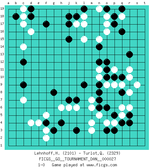 Last move : 1-0 2012 May 22 1:56:52 [Event "FICGS__GO__TOURNAMENT_DAN__000027"] [Site "FICGS"] [Date "2011.09.18"] [Round "1"] [Black "Lehnhoff,Heinz-Georg"] [White "Turlot,Quentin"] [Result "1-0"] [Rating 1 "2101"] [Rating 2 "2329"] 1.q16 d4 2.q4 d16 3.f17 c14 4.d18 c17 5.j17 r6 6.o3 r11 7.r5 q6 8.r13 p11 9.c9 c7 10.c12 m3 11.o6 p4 12.p3 q5 13.r4 n5 14.h4 f3 15.q8 r8 16.r9 q9 17.q10 p9 18.k3 m4 19.g3 f2 20.f4 e4 21.n6 m6 22.n8 m7 23.p10 r10 24.o10 o9 25.n9 n10 26.o11 n11 27.o12 s9 28.l9 f5 29.p5 o4 30.n7 h6 31.k7 k6 32.j7 j6 33.g8 o17 34.n12 l17 35.p17 o16 36.j15 l15 37.b18 c18 38.d19 c19 39.k18 l18 40.p18 o18 41.n14 n15 42.o19 n19 43.l19 p19 44.q19 q18 45.o19 k17 46.j18 1-0 This go game has been lost on time (started : 2011.09.18 21:31:33) Here are the names of the openings (joseki) played in the four corners : Corner d16 : d16 f17 Hoshi (Hwajeom, Seongjeom, Xingwei`) 4-4 Point. The star or hoshi (4-4) point, emphasizing influence at the potential expense of territory. Ikken Kakari (Hankan Keolch'im, Yi Gua`jiao~, 1-Space Low Approach). Black 2 is the standard approach move to the 4-4. Corner q4 : q4 r6 Hoshi (Hwajeom, Seongjeom, Xingwei`) 4-4 Point. The star or hoshi (4-4) point, emphasizing influence at the potential expense of territory. Ikken Kakari (Hankan Keolch'im, Yi Gua`jiao~, 1-Space Low Approach). White 2 is the standard approach move to the 4-4. Corner q16 : q16 r11 Hoshi (Hwajeom, Seongjeom, Xingwei`) 4-4 Point. The star or hoshi (4-4) point, emphasizing influence at the potential expense of territory. Corner d4 : d4 c9 Hoshi (Hwajeom, Seongjeom, Xingwei`) 4-4 Point. The star or hoshi (4-4) point, emphasizing influence at the potential expense of territory. Player Black won this Go (weiqi, baduk) game. Follow this game move after move (download)Beginner's games are surprising, often incoherent and incomprehensible. When you improve, your game gains in consistency but flirts with stupidity: you become satisfied with truisms and mechanical movements, you try to obtain a feeling for clearness and style the easy way. (Pierre Audouard) Fortune favours the audacious. (Desiderius Erasmus)