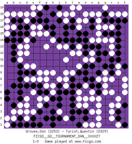 Last move : 1-0 2012 April 27 1:20:38 [Event "FICGS__GO__TOURNAMENT_DAN__000027"] [Site "FICGS"] [Date "2011.09.18"] [Round "1"] [Black "Groves,Don"] [White "Turlot,Quentin"] [Result "1-0"] [Rating 1 "2253"] [Rating 2 "2329"] 1.q15 d5 2.q4 d17 3.d15 d12 4.g16 e15 5.e14 f15 6.d16 e16 7.c17 c18 8.e17 d18 9.f17 d14 10.c14 d13 11.b17 b18 12.b15 a17 13.c16 a16 14.b12 a18 15.b13 e18 16.c10 g15 17.h16 g13 18.l16 r6 19.p6 q8 20.r10 o3 21.l4 m5 22.o7 p5 23.q5 q6 24.p9 s4 25.h3 o5 26.d3 e3 27.e2 d2 28.c2 d4 29.d1 c3 30.f3 d2 31.c7 d3 32.g2 b2 33.r17 n17 34.n15 k17 35.l17 l18 36.k16 j18 37.j17 k18 38.h18 p17 39.q18 p18 40.l7 j15 41.h15 h14 42.j14 j13 43.k14 k13 44.l14 k11 45.m3 r13 46.q2 p3 47.p13 r16 48.r15 q16 49.s16 p15 50.q3 r3 51.n6 n5 52.n2 o1 53.l5 m6 54.m7 q14 55.s14 p14 56.o16 p16 57.q12 s18 58.s17 q19 59.s13 r14 60.s15 r12 61.s12 r18 62.s2 r2 63.r1 r4 64.m18 m17 65.s8 b6 66.b7 c11 67.b11 d10 68.c9 g9 69.d9 e10 70.r5 s5 71.r7 q7 72.q1 p1 73.s6 s1 74.t1 p4 75.f18 e19 76.o13 k9 77.m9 m12 78.l13 l12 79.c6 b5 80.r11 o11 81.j7 h6 82.h8 f5 83.l6 h9 84.g6 g5 85.h5 g7 86.f6 e6 87.f7 f8 88.e7 e8 89.d7 h7 90.o17 o18 91.q17 t18 92.b1 c1 93.s3 t6 94.c2 b3 95.c1 r8 96.s7 p2 97.c5 f4 98.a6 h4 99.j5 g3 100.g4 e1 101.f1 g3 102.j2 f2 103.e1 j3 104.h2 a2 105.b4 g1 106.f3 c4 107.a5 f2 108.h1 k2 109.j4 a1 110.f3 j16 111.k15 f2 112.t4 s1 113.f3 s9 114.g4 s10 115.s11 b16 116.c15 n1 117.m1 m10 118.n10 n11 119.o10 l9 120.r9 t8 121.t10 t7 122.p11 m8 123.n9 j8 124.j6 g8 125.j19 m19 126.l8 o6 127.p7 n7 128.n8 p8 129.o8 q9 130.q10 a15 131.a14 c13 132.b14 f19 133.g19 m4 134.l3 o12 135.n13 m13 136.k19 n18 137.m14 o14 138.n14 k8 139.e9 f9 140.n3 d8 141.c8 k7 142.k6 m16 143.m15 c12 144.n12 f16 145.t17 l19 146.g17 h19 147.j19 n4 148.n6 m2 149.l2 n7 150.p12 1-0 Here are the names of the openings (joseki) played in the four corners : Corner d16 : d17 d15 Komoku (Somok, Xiao~mu`) 3-4 Point. The komoku (3-4) point is the traditional corner enclosure move.. Ikken Takagakari (Hankan Nop'dakeolch'im, Yi Gaogua`jiao~, 1-Space High Approach). The 5-4 approach move has become more popular in modern times, as modern Go emphasizes speed and influence. Corner q4 : q4 r6 Hoshi (Hwajeom, Seongjeom, Xingwei`) 4-4 Point. The star or hoshi (4-4) point, emphasizing influence at the potential expense of territory. Ikken Kakari (Hankan Keolch'im, Yi Gua`jiao~, 1-Space Low Approach). White 2 is the standard approach move to the 4-4. Corner d4 : d5 h3 Takamoku (Gomok, Gaomu`) 5-4 Point. The takamoku (high) point (5-4). With its emphasis on influence, the 5-4 point complements the 4-4 (hoshi) point in creating an influence-oriented fuseki. Player Black won this Go (weiqi, baduk) game. Follow this game move after move (download)It is difficult to know exactly what you are doing. (Pierre Audouard) Imagination is more important than knowledge. Knowledge is limited. Imagination encircles the world. (Albert Einstein)