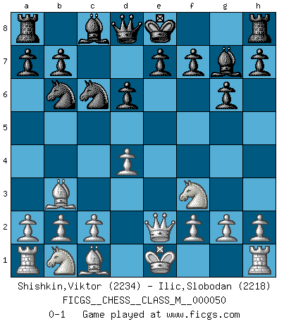 Last move : 0-1 2011 November 28 2:12:32 [Event "FICGS__CHESS__CLASS_M__000050"] [Site "FICGS"] [Date "2011.09.20"] [Round "1"] [White "Shishkin,Viktor"] [Black "Ilic,Slobodan"] [Result "0-1"] [WhiteElo "2234"] [BlackElo "2218"] 1.e4 Nf6 2.e5 Nd5 3.d4 d6 4.Nf3 g6 5.Bc4 Nb6 6.Bb3 Bg7 7.Qe2 Nc6 8.exd6 cxd6 0-1 This chess game has been lost on time (started : 2011.09.20 8:53:32) Alekhine's defense : Modern, Fianchetto variation Player Black won this chess game. Follow this game move after move (download)Chess is a terrible game. If you have no center, your opponent has a freer position. If you do have a center, then you really have something to worry about ! (Siegbert Tarrasch) Wie ich sie so einen nach dem anderen nieder mähte wurde meine Überlegenheit offensichtlich. (José Raúl Capablanca) Nos gusta pensar. (Gary Kasparov) D'abord les bases : Jouez et étudiez, puis étudiez et jouez, ensuite jouez et étudiez, puis étudiez et jouez. Deuxièmement : Donnez toujours le meilleur de vous-même ! (Ken Smith) To err is human, but to really foul things up requires a computer. (Farmer's Almanac, 1978)