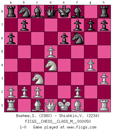 Last move : 1-0 2011 December 8 15:46:17 [Event "FICGS__CHESS__CLASS_M__000050"] [Site "FICGS"] [Date "2011.09.20"] [Round "1"] [White "Boehme,Sebastian"] [Black "Shishkin,Viktor"] [Result "1-0"] [WhiteElo "2380"] [BlackElo "2234"] 1.e4 c5 2.Nf3 d6 3.d4 cxd4 4.Nxd4 Nf6 5.Nc3 a6 6.h3 e6 7.g4 d5 8.exd5 1-0 This chess game has been lost on time (started : 2011.09.20 8:53:32) Sicilian : Najdorf, Adams attack Player White won this chess game. Follow this game move after move (download)A bad plan is better than none at all. (Frank Marshall) Fischer machte Schach einfach zu einer aufregenden Sache, wann immer er sich ans Brett setzte. (Raymond Keene) El Jaque al descubierto es el bombardero del tablero. (Reuben Fine) Les Echecs sont affaire de jugement sensible. Savoir quand frapper et quand esquiver. (Fischer) The production of too many useful things results in too many useless people. (Karl Marx)