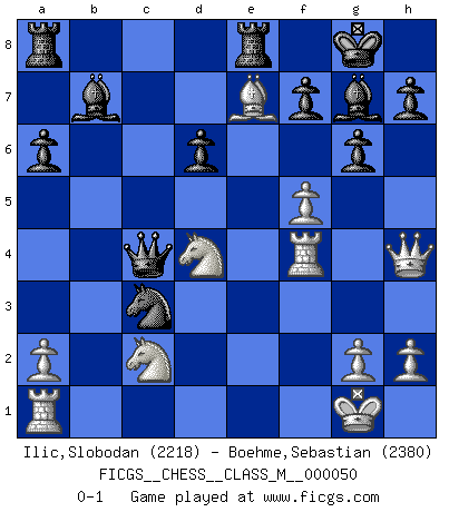 Last move : 0-1 2012 April 2 22:59:41 [Event "FICGS__CHESS__CLASS_M__000050"] [Site "FICGS"] [Date "2011.09.20"] [Round "1"] [White "Ilic,Slobodan"] [Black "Boehme,Sebastian"] [Result "0-1"] [WhiteElo "2218"] [BlackElo "2380"] 1.e4 c5 2.Na3 Nc6 3.Bb5 Nf6 4.d3 g6 5.c3 Bg7 6.f4 O-O 7.Nf3 Qc7 8.O-O d6 9.Qe1 a6 10.Bxc6 Qxc6 11.Qh4 b5 12.f5 c4 13.Nd4 Qc5 14.dxc4 b4 15.Nac2 bxc3 16.bxc3 Qxc4 17.Rf3 Bb7 18.Bg5 Nxe4 19.Bxe7 Nxc3 20.Rf4 Rfe8 0-1 This chess game has been lost on time (started : 2011.09.20 8:53:32) Sicilian defense Kingside Castling by player Black (move 6) Kingside Castling by player White (move 8) Player Black won this chess game. Follow this game move after move (download)The Pawns are the soul of the game. (Francois Andre Danican Philidor) Über Frauen: Chess is better. (Robert James Fischer) Bobby Fischer es el mas grande genio de Ajedrez de todos los tiempos. (Alexander Kotov) Je ne crois pas en la psychologie, je crois aux bons coups. (Robert Fischer) If you don't practice you don't deserve to win. (Andre Agassi)