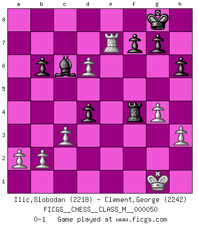 Last move : 0-1 2012 March 17 20:54:44 [Event "FICGS__CHESS__CLASS_M__000050"] [Site "FICGS"] [Date "2011.09.20"] [Round "1"] [White "Ilic,Slobodan"] [Black "Clement,George"] [Result "0-1"] [WhiteElo "2218"] [BlackElo "2242"] 1.e4 e5 2.Nf3 Nc6 3.Nc3 Nf6 4.g3 Bc5 5.Bg2 d6 6.h3 Be6 7.O-O O-O 8.d3 a5 9.Be3 Bxe3 10.fxe3 h6 11.d4 exd4 12.exd4 d5 13.e5 Ne4 14.Qe1 Nxc3 15.Qxc3 a4 16.Ne1 Qd7 17.Kh2 b6 18.Nd3 Ne7 19.Rad1 Rac8 20.Qa3 c5 21.dxc5 Nf5 22.Nf4 Rxc5 23.g4 Nh4 24.c3 Qc7 25.Rde1 Nxg2 26.Kxg2 Bc8 27.Qxa4 Bb7 28.Kg1 Rc4 29.Qb5 Bc6 30.Qb3 Re8 31.Qa3 Ra4 32.Qd6 Qxd6 33.exd6 Rxe1 34.Rxe1 Rxf4 35.Re7 d4 0-1 This chess game has been lost on time (started : 2011.09.20 8:53:32) Four knights game Kingside Castling by player White (move 7) Kingside Castling by player Black (move 7) Player Black won this chess game. Follow this game move after move (download)Fischer is the strongest player in the world. In fact, the strongest player who ever lived. (Larry Evans) Im Schach nämlich geht es darum, daß Ich des Gegners klein zu kriegen, sein Ego zu zerbrechen und zu zermahlen, seine Selbstachtung zu zertreten und zu verscharren und seine ganze mißachtenswerte sogenannte Persönlichkeit ein für alle Mal tot zu hacken und zu zerstampfen und dadurch die menschliche Gesellschaft von einer stinkenden Pestbeule zu befreien. Es ist ein königliches Spiel. (Robert James Fischer) Hoy en día, si tu no eres un Gran Maestro a los 14 años, es mejor que lo olvides. (Anand Viswanathan) On croit qu'il y a plus de mauvais joueurs que de bons joueurs, c'est faux : Il y a autant de joueurs qui gagnent que de joueurs qui perdent. (Philippe Geluck) Philosophers use a language that is already deformed as though by shoes that are too tight. (Ludwig Wittgenstein)