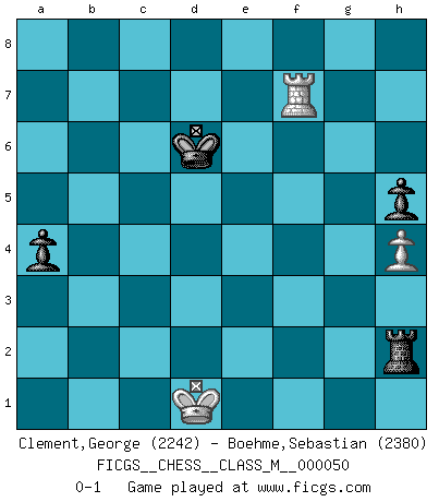 Last move : 0-1 2012 May 6 17:2:13 [Event "FICGS__CHESS__CLASS_M__000050"] [Site "FICGS"] [Date "2011.09.20"] [Round "1"] [White "Clement,George"] [Black "Boehme,Sebastian"] [Result "0-1"] [WhiteElo "2242"] [BlackElo "2380"] 1.e4 c5 2.Nf3 d6 3.d4 cxd4 4.Nxd4 Nf6 5.Nc3 a6 6.Bg5 e6 7.Qf3 Bd7 8.O-O-O Nc6 9.Kb1 Be7 10.Be2 b5 11.a3 Qc7 12.Qg3 Rb8 13.Nb3 b4 14.axb4 Nxb4 15.Bxf6 gxf6 16.Nd2 Kf8 17.Qh3 h5 18.Nc4 Nc6 19.f4 Na5 20.Nd2 Qc5 21.f5 d5 22.Qf3 Bd6 23.Nb3 Nxb3 24.fxe6 Be5 25.exd7 Nd4 26.Qe3 Qb4 27.d8Q+ Kg7 28.Nb5 Rhxd8 29.c3 Qb3 30.Rxd4 Bxd4 31.Qxd4 dxe4 32.Bc4 Rxd4 33.Bxb3 Rxb5 34.cxd4 Rxb3 35.Rd1 Re3 36.d5 Kf8 37.d6 Ke8 38.Kc1 Re2 39.Rf1 e3 40.Rf3 Kd7 41.h4 a5 42.Kd1 Rxg2 43.Rxe3 Rxb2 44.Rf3 a4 45.Rxf6 Rh2 46.Rxf7+ Kxd6 0-1 Sicilian : Najdorf, 6...e6 Queenside Castling by player White (move 8) Promotion Queen by player White (move 27) 10 pieces endgame at move 43 : White KRPP , Black KRPPPP WHITE : King + 1 Rook 2 Pawns BLACK : King + 1 Rook 4 Pawns 9 pieces endgame at move 45 : White KRPP , Black KRPPP WHITE : King + 1 Rook 2 Pawns BLACK : King + 1 Rook 3 Pawns 8 pieces endgame at move 46 : White KRPP , Black KRPP WHITE : King + 1 Rook 2 Pawns BLACK : King + 1 Rook 2 Pawns 7 pieces endgame at move 46 : White KRP , Black KRPP WHITE : King + 1 Rook 1 Pawn BLACK : King + 1 Rook 2 Pawns Player Black won this chess game. Follow this game move after move (download)A Chess game is a dialogue, a conversation between a player and his opponent. Each move by the opponent may contain threats or be a blunder, but a player cannot defend against threats or take advantage of blunders if he does not first ask himself: What is my opponent planning after each move ? (Bruce A. Moon) Karpov ist ein Museumsstück. (Garry Kasparov) Una victoria por una combinación errónea, aunque sea espectacular, me llena de horror artístico. (Wilhelm Steinitz) Aux échecs, l'amour-propre est satisfait quand on remporte la victoire, mais il n'y a pas de honte à être battu. (Benjamin Franklin) Warrior pose battles inner weakness and wins focus. You see that there is no war within you. You're on your own side, and you are your own strength. (Terri Guillemets)