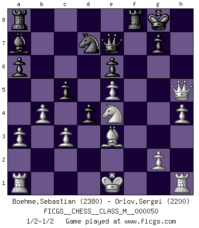 Last move : 1/2-1/2 2012 January 1 11:18:9 [Event "FICGS__CHESS__CLASS_M__000050"] [Site "FICGS"] [Date "2011.09.20"] [Round "1"] [White "Boehme,Sebastian"] [Black "Orlov,Vladimir"] [Result "1/2-1/2"] [WhiteElo "2380"] [BlackElo "2200"] 1.e4 e6 2.d4 d5 3.Nc3 Nf6 4.e5 Nfd7 5.f4 c5 6.Nf3 Nc6 7.Be3 a6 8.a3 cxd4 9.Nxd4 Bc5 10.Nce2 Qe7 11.b4 Ba7 12.Nxc6 bxc6 13.Nd4 Bb7 14.c3 O-O 15.Bd3 c5 16.Nf3 d4 17.Bxh7+ Kxh7 18.Ng5+ Kg8 19.Qh5 Be4 20.Nxe4 f6 21.h4 fxe5 22.fxe5 1/2-1/2 French : Steinitz, Boleslavsky variation Kingside Castling by player Black (move 14) This chess game ended in a draw. Follow this game move after move (download)Without error there can be no brilliancy. (Emanuel Lasker) Du kannst im Schach nur gut werden, wenn du das Spiel liebst. (Robert James Fischer) No hay otro maestro que tenga una voluntad terrífica de ganar. Al tablero, el irradía peligro y aún los oponentes mas fuertes tienden a congelarse como liebres cuando olfatean a una pantera. Aún sus debilidades son peligrosas. Con las blancas, su juego de apertura es predecible - te es posible hacer planes en su contra - pero es tan fuerte que tus planes casi nunca funcionan. En el juego medio, su precisión e invención son fabulosas y en finales, tú simplemente no le puedes vencer. (Experto Alemán anónimo) Horreur, mais aussi harmonie suprême : qu'y avait-il en effet au monde en dehors des échecs ? Le brouillard, l'inconnu, le non-être... (Vladimir Nabokov) It is the aim of the modern school, not to treat every position according to one general law, but according to the principle inherent in the position. (Richard Reti)