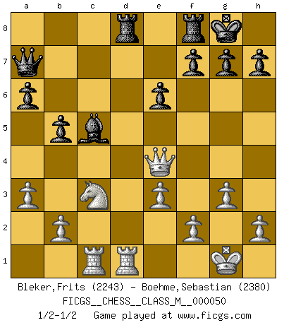 Last move : 1/2-1/2 2012 February 13 11:53:37 [Event "FICGS__CHESS__CLASS_M__000050"] [Site "FICGS"] [Date "2011.09.20"] [Round "1"] [White "Bleker,Frits"] [Black "Boehme,Sebastian"] [Result "1/2-1/2"] [WhiteElo "2243"] [BlackElo "2380"] 1.d4 Nf6 2.c4 e6 3.g3 d5 4.Bg2 Be7 5.Nf3 O-O 6.O-O dxc4 7.Qc2 a6 8.Qxc4 b5 9.Qc2 Bb7 10.Bd2 Be4 11.Qc1 Bb7 12.Bf4 Nd5 13.Nc3 Nxf4 14.Qxf4 Qd6 15.Rac1 Nd7 16.Rfd1 Rad8 17.Ne5 Nxe5 18.Bxb7 Qb6 19.Qxe5 Qxb7 20.e3 c6 21.a3 Qa7 22.Qe4 c5 23.dxc5 Bxc5 1/2-1/2 Catalan : Closed, 5.Nf3 Kingside Castling by player Black (move 5) Kingside Castling by player White (move 6) This chess game ended in a draw. Follow this game move after move (download)First-class players lose to second class players because second-class players sometimes play a first-class game. (Tarrasch) Offensichtlich kennt Kasparow nichts anderes als Schach, und ich könnte 500 weitere Spieler dieser Sorte benennen. (Judith Polgar) El Ajedrez detiene a su maestro dentro de sus propios vínculos, encadenando la mente y el cerebro, por lo que la libertad interior del mas fuerte debe sufrir. (Albert Einstein) Les ravages du H expliquent la différence de niveau entre Tal et Thal [Abergel]. The message for business people contemplating their place in the cyberspace is simple and direct: get linked or get lost. (Vic Sussman and Kenan Pollack)