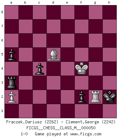 Last move : 1-0 2012 July 29 20:26:34 [Event "FICGS__CHESS__CLASS_M__000050"] [Site "FICGS"] [Date "2011.09.20"] [Round "1"] [White "Fraczek,Dariusz"] [Black "Clement,George"] [Result "1-0"] [WhiteElo "2262"] [BlackElo "2242"] 1.c4 e6 2.g3 d5 3.Bg2 Nf6 4.Nf3 dxc4 5.Na3 Bxa3 6.bxa3 O-O 7.Bb2 Nc6 8.Qc2 Qd6 9.Qxc4 e5 10.O-O Be6 11.Qc3 Nd5 12.Qc2 Nf6 13.Rfd1 Rfe8 14.Rac1 a5 15.d3 Ra6 16.Rd2 Bf5 17.Qc5 Rb6 18.Qxd6 cxd6 19.Ba1 h6 20.Rdc2 Be6 21.Nd2 d5 22.f4 exf4 23.gxf4 Bg4 24.e4 Ne7 25.Bd4 Rc6 26.Rxc6 bxc6 27.f5 Nh5 28.Bf1 Nf4 29.Bc5 Be2 30.Rc3 Bxd3 31.Bxd3 dxe4 32.Ba6 Nxf5 33.Rc4 e3 34.Re4 Ra8 35.Rxf4 exd2 36.Be2 g6 37.Rf1 Re8 38.Kf2 Re5 39.Bb6 Nd6 40.Bf3 Nc4 41.Bd4 Rf5 42.Ke2 c5 43.Bc3 Kf8 44.Bxd2 Nxd2 45.Kxd2 Rf4 46.Ke3 Ra4 47.Bd5 Rxa3+ 48.Kf4 Ke7 49.Rf2 Rc3 50.Re2+ Kf6 51.Ke4 Ke7 52.Bc4 f5+ 53.Kd5 Kf6 54.Re6+ Kg5 55.Ra6 Ra3 56.Bb3 f4 57.Ke4 f3 58.Bf7 Ra4+ 59.Ke5 Kh4 60.Rxg6 h5 61.Rh6 Kh3 62.Rxh5+ Kg2 63.Bb3 Ra3 64.Bd5 c4 65.Rg5+ Kxh2 66.Kf4 f2 67.Rg2+ 1-0 English Opening Kingside Castling by player Black (move 6) Kingside Castling by player White (move 10) 10 pieces endgame at move 62 : White KRBPP , Black KRPPP WHITE : King + 1 Rook 1 Bishop 2 Pawns BLACK : King + 1 Rook 3 Pawns 9 pieces endgame at move 65 : White KRBP , Black KRPPP WHITE : King + 1 Rook 1 Bishop 1 Pawn BLACK : King + 1 Rook 3 Pawns Player White won this chess game. Follow this game move after move (download)Fischer Chess play was always razor-sharp, rational and brilliant. One of the best ever. (Dave Regis) Ich las kürzlich ein Buch von Nietzsche. Er sagte Religion verdumme nur die Menschen. Ich stimme zu. (Robert James Fischer) Cuando tu no sabes absolutamente que mas hacer, es tiempo de entrar en pánico. (John van der Wiel) L'attaque fait le spectacle, la défense gagne les matchs. (Dicton footballistique) It is not true that people stop pursuing dreams because they grow old, they grow old because they stop pursuing dreams. (Gabriel Garcia Marquez)