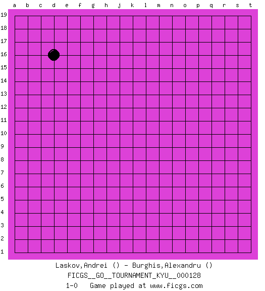 Last move : 1-0 2011 October 24 0:26:15 [Event "FICGS__GO__TOURNAMENT_KYU__000128"] [Site "FICGS"] [Date "2011.09.23"] [Round "1"] [Black "Laskov,Andrei"] [White "Burghis,Alexandru"] [Result "1-0"] 1.d16 1-0 This go game has been lost on time (started : 2011.09.23 13:43:46) Here are the names of the openings (joseki) played in the four corners : Player Black won this Go (weiqi, baduk) game. Follow this game move after move (download)Don't make compact groups of stones. (Anonymous) Experiences are the keys to life. (Daniel Parmet)
