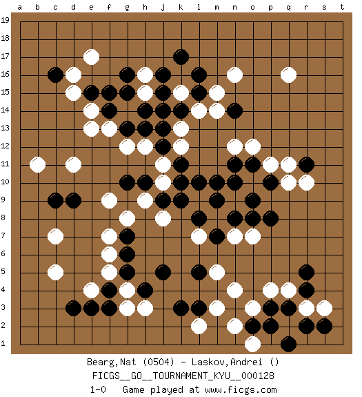 Last move : 1-0 2012 January 9 5:46:50 [Event "FICGS__GO__TOURNAMENT_KYU__000128"] [Site "FICGS"] [Date "2011.09.23"] [Round "1"] [Black "Bearg,Nat"] [White "Laskov,Andrei"] [Result "1-0"] [Rating 1 "0504"] 1.d3 d16 2.r4 q16 3.k10 g12 4.k17 k12 5.r11 o10 6.c9 b11 7.l3 l7 8.g7 j8 9.n14 n12 10.n8 n7 11.o8 g8 12.g10 f7 13.g6 m8 14.m9 l9 15.l10 n9 16.m10 o7 17.p8 f6 18.g5 c5 19.f14 g14 20.g13 f13 21.h13 h12 22.j13 e14 23.f15 k13 24.g15 h15 25.h14 d11 26.j15 h16 27.e15 e13 28.o11 p11 29.n10 o12 30.n11 k15 31.j16 q10 32.o9 e17 33.c16 d15 34.j12 j11 35.k14 l14 36.j14 n16 37.l15 m15 38.l16 j10 39.k11 m14 40.g16 r10 41.p10 q11 42.k9 p4 43.l8 m5 44.m7 m3 45.l5 l2 46.k3 c7 47.d9 r3 48.r5 f9 49.j9 h9 50.h10 s3 51.q3 q4 52.p3 o3 53.o2 q2 54.p2 n2 55.r2 o1 56.q1 n4 57.s2 f5 58.f4 e4 59.e3 g4 60.f3 h3 61.h4 g3 62.j5 1-0 This go game has been lost on time (started : 2011.09.23 13:43:46) Here are the names of the openings (joseki) played in the four corners : Corner q16 : q16 r11 Hoshi (Hwajeom, Seongjeom, Xingwei`) 4-4 Point. The star or hoshi (4-4) point, emphasizing influence at the potential expense of territory. Player Black won this Go (weiqi, baduk) game. Follow this game move after move (download)Connect with good shape. (Anonymous) Computers are like Old Testament gods; lots of rules and no mercy. (Joseph Campbell)