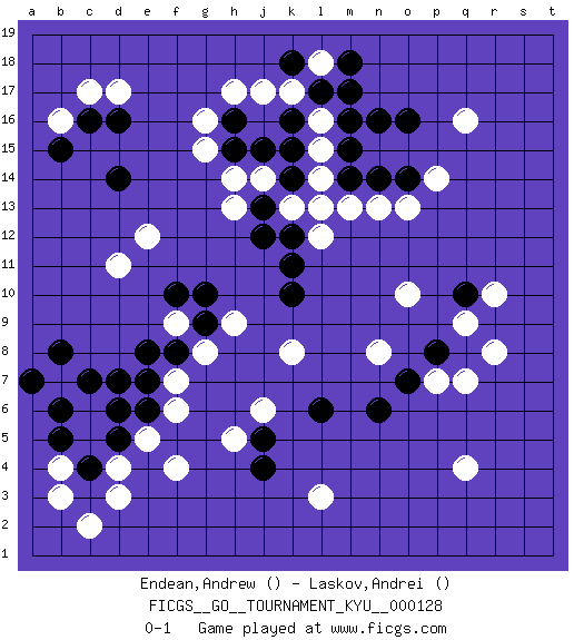 Last move : 0-1 2011 November 21 21:43:52 [Event "FICGS__GO__TOURNAMENT_KYU__000128 "] [Site "FICGS"] [Date "2011.09.23"] [Round "1"] [Black "Endean,Andrew "] [White "Laskov,Andrei "] [Result "0-1"] 1.k10 q4 2.d16 d4 3.k11 q16 4.q10 o10 5.d7 f7 6.o16 p14 7.n16 n13 8.m14 m13 9.n14 o13 10.o14 l14 11.k14 l15 12.m16 k13 13.k15 l16 14.l17 k17 15.l13 l12 16.k16 l18 17.m17 j17 18.m15 l13 19.k12 h13 20.j13 j14 21.j12 d11 22.j15 h14 23.h15 g15 24.h16 g16 25.m18 h17 26.k18 f9 27.e7 f6 28.e6 e5 29.d5 f4 30.c4 c5 31.d6 c6 32.c7 b4 33.c3 b7 34.b8 d3 35.a7 c2 36.b6 b3 37.b5 r8 38.p8 q7 39.e8 n8 40.n6 k8 41.c4 p7 42.o7 q9 43.l6 r10 44.f8 g8 45.g9 h9 46.g10 e12 47.d14 c17 48.c16 d17 49.f10 b16 50.b15 j6 51.j5 h5 52.j4 l3 0-1 Here are the names of the openings (joseki) played in the four corners : Corner d4 : d4 d7Hoshi (Hwajeom, Seongjeom, Xingwei`) 4-4 Point. The star or hoshi (4-4) point, emphasizing influence at the potential expense of territory.Niken Takagakari (Dukan Nop'dakeolch'im, E`r Gaojia, 2-Space High Approach). Black 2 is a light approach move. Rarely played in even games, Black 2 is typically employed in handicap games. White continues with 6-4 or 3-10. In Korean Sunjang Baduk White has a stone on 8-4. Corner q16 : q16 o16Hoshi (Hwajeom, Seongjeom, Xingwei`) 4-4 Point. The star or hoshi (4-4) point, emphasizing influence at the potential expense of territory.Ikken Takagakari (Hankan Nop'dakeolch'im, Yi Gaojia, 1-Space High Approach). White typically responds at 6-4 or 3-10. White 4-10 is played when White finds play on the right side advantageous. White 4-8 or 3-8 may be played when White has support at top. Corner d16 : d16 j17Hoshi (Hwajeom, Seongjeom, Xingwei`) 4-4 Point. The star or hoshi (4-4) point, emphasizing influence at the potential expense of territory. Player White won this Go (weiqi, baduk) game.Follow this game move after move (download ) Territory really exists only in the end. (Pierre Audouard) I don't believe in psychology. I believe in good moves. (Bobby Fischer)