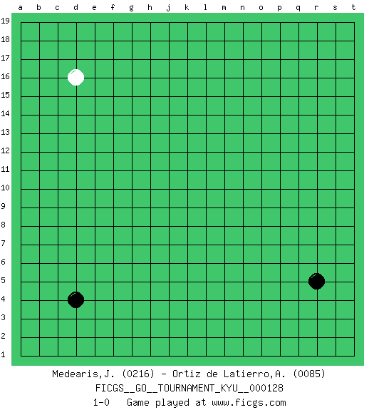 Last move : 1-0 2011 October 26 0:49:13 [Event "FICGS__GO__TOURNAMENT_KYU__000128"] [Site "FICGS"] [Date "2011.09.23"] [Round "1"] [Black "Medearis,John"] [White "Ortiz de Latierro,Aitor"] [Result "1-0"] [Rating 1 "0216"] [Rating 2 "0085"] 1.d4 d16 2.r5 1-0 This go game has been lost on time (started : 2011.09.23 13:43:46) Here are the names of the openings (joseki) played in the four corners : Corner q4 : r5 1-0 Mokuhazushi (Waemok, Wai`mu`) 5-3 Point. The mokuhazushi (5-3) point was popular in the Edo period in Japan (1600 - 1867). It emphasizes influence; territorially, it is inferior to the 3-4 point. Player Black won this Go (weiqi, baduk) game. Follow this game move after move (download)While the Baroque rules of chess could only have been created by humans, the rules of go are so elegant, organic, and rigorously logical that if intelligent life forms exist elsewhere in the universe, they almost certainly play go. (Edward Lasker, international chess master) The only thing that matters is the evidence. (Horatio Caine, C.S.I. Miami)