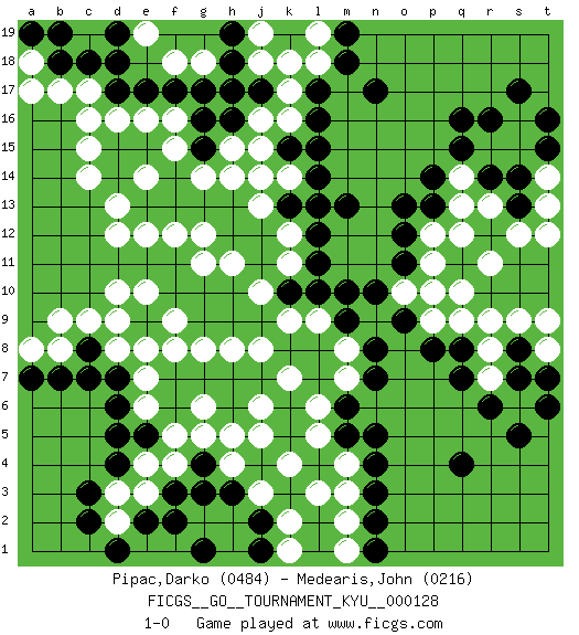 Last move : 1-0 2012 January 21 6:26:6 [Event "FICGS__GO__TOURNAMENT_KYU__000128"] [Site "FICGS"] [Date "2011.09.23"] [Round "1"] [Black "Pipac,Darko"] [White "Medearis,John"] [Result "1-0"] [Rating 1 "0484"] [Rating 2 "0216"] 1.d4 d16 2.q4 r15 3.q16 k16 4.l15 k14 5.m13 d10 6.r14 q14 7.q15 r13 8.s14 s15 9.s13 q13 10.r16 s16 11.s17 q10 12.k10 k4 13.g7 j8 14.f13 g11 15.f17 f16 16.e17 e16 17.d17 c17 18.g17 h15 19.n8 m7 20.m5 l5 21.m6 l6 22.n7 m8 23.m9 l9 24.l10 n9 25.m10 k9 26.p10 p9 27.o9 o10 28.n10 p11 29.p8 q9 30.o11 p10 31.q8 r11 32.o12 p12 33.o13 s12 34.t15 t13 35.t16 t12 36.p13 q12 37.p14 r8 38.r6 m4 39.n5 j6 40.n4 l3 41.n3 m3 42.n2 m2 43.n1 m1 44.s8 r7 45.q7 r9 46.s7 s9 47.t6 t8 48.t7 t9 49.s5 j10 50.j11 h11 51.k13 k12 52.j12 j13 53.l13 k11 54.h12 g12 55.h13 j14 56.g13 g14 57.g16 f15 58.f14 h14 59.g15 d13 60.d14 e12 61.e13 d12 62.e15 f12 63.d15 c16 64.l12 e14 65.l11 c14 66.h16 j16 67.j17 k17 68.l16 j18 69.h17 k18 70.h18 j15 71.l14 j19 72.h19 c15 73.c18 b17 74.b18 a18 75.d19 e19 76.d18 f18 77.b19 g18 78.a19 a17 79.l17 l18 80.m18 l19 81.m19 e7 82.e8 f8 83.f7 d8 84.e9 f9 85.d7 e6 86.f6 e10 87.d6 d9 88.e5 e8 89.h6 g5 90.h5 h4 91.g4 f4 92.g3 f5 93.f3 e4 94.d5 e3 95.f2 d3 96.c3 d2 97.c2 g8 98.j7 k7 99.h7 j5 100.e2 h8 101.d1 g6 102.h3 j3 103.j2 k2 104.j1 k1 105.g1 h5 106.c8 b8 107.b7 c9 108.c7 a8 109.a7 b9 110.k15 t14 111.n17 pass 112.pass 1-0 Here are the names of the openings (joseki) played in the four corners : Corner q16 : r15 q16 Mokuhazushi (Waemok, Wai`mu`) 5-3 Point. The mokuhazushi (5-3) point was popular in the Edo period in Japan (1600 - 1867). It emphasizes influence; territorially, it is inferior to the 3-4 point. Corner d16 : d16 f13 Hoshi (Hwajeom, Seongjeom, Xingwei`) 4-4 Point. The star or hoshi (4-4) point, emphasizing influence at the potential expense of territory. Player Black won this Go (weiqi, baduk) game. Follow this game move after move (download)At the head of two stones in a row, play hane. (Anonymous) Two beer, or not two beer. (Unknown)