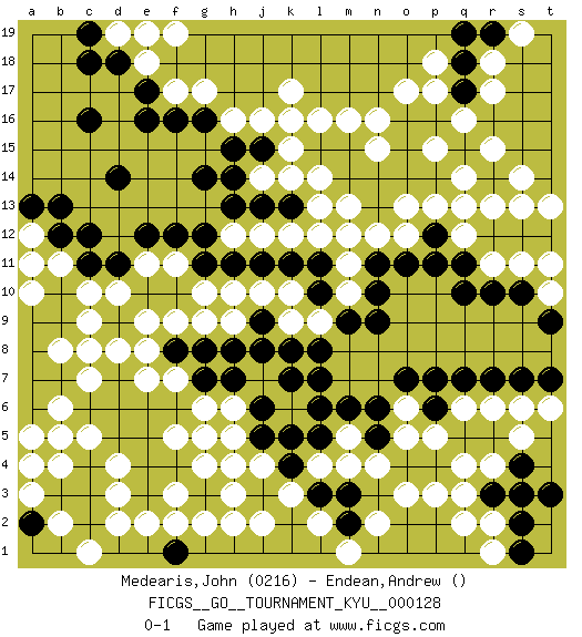 Last move : 0-1 2012 January 5 20:0:55 [Event "FICGS__GO__TOURNAMENT_KYU__000128"] [Site "FICGS"] [Date "2011.09.23"] [Round "1"] [Black "Medearis,John"] [White "Endean,Andrew"] [Result "0-1"] [Rating 1 "0216"] 1.e3 q16 2.c16 q4 3.k16 d10 4.q10 h4 5.k4 m4 6.f4 h5 7.j6 h6 8.h7 g6 9.g7 f7 10.f6 f5 11.f8 e7 12.e6 e8 13.e5 g5 14.g8 e9 15.d14 d6 16.d5 c5 17.c4 d4 18.e4 d3 19.c3 d2 20.c2 e2 21.c6 b5 22.d7 f3 23.g3 f2 24.b7 g4 25.d6 b4 26.b3 a3 27.a2 a4 28.a6 c1 29.j5 h3 30.j3 g2 31.l5 m5 32.m6 l4 33.l6 h2 34.f1 b2 35.c8 c9 36.a8 b6 37.a7 d8 38.d11 c7 39.k7 j4 40.j8 k3 41.k5 j2 42.h8 f9 43.k8 g9 44.l7 h9 45.j9 j10 46.g11 h10 47.g14 k15 48.l15 k14 49.k13 l14 50.j15 j14 51.j13 l13 52.h14 l16 53.m15 j16 54.h15 k17 55.h13 m11 56.n9 k10 57.l10 m10 58.m9 l9 59.l11 l12 60.k11 k12 61.j11 j12 62.h11 h12 63.g12 k9 64.b9 b8 65.a9 c8 66.b10 c10 67.c11 e11 68.e12 f11 69.f12 g10 70.n11 m12 71.o14 n15 72.n13 m16 73.m14 m13 74.n14 n12 75.n10 o12 76.p12 p13 77.p14 o13 78.q13 q12 79.p11 q14 80.o15 n16 81.o11 k16 82.q15 r13 83.r14 r15 84.q13 s14 85.o16 o17 86.r12 q14 87.q11 q13 88.p16 p17 89.n5 n4 90.o4 o5 91.n6 o3 92.q17 p15 93.p4 p5 94.p6 p3 95.l8 o6 96.o7 a5 97.p7 b11 98.b12 a10 99.c12 r11 100.s12 s11 101.t11 s13 102.t12 t10 103.s10 t13 104.t9 t11 105.r10 q6 106.q7 r6 107.r7 s6 108.s7 t6 109.t7 h16 110.g16 g17 111.f16 f17 112.e17 e18 113.e16 f19 114.d18 d19 115.c19 e19 116.c18 a12 117.a13 a11 118.b13 r17 119.m2 n2 120.l3 l2 121.m3 m1 122.r3 r4 123.s4 s5 124.t3 q3 125.s2 r2 126.s3 r1 127.s1 q2 128.q18 r18 129.r19 p18 130.q19 s19 131.pass pass 0-1 Here are the names of the openings (joseki) played in the four corners : Corner d4 : e3 h4 Mokuhazushi (Waemok, Wai`mu`) 5-3 Point. The mokuhazushi (5-3) point was popular in the Edo period in Japan (1600 - 1867). It emphasizes influence; territorially, it is inferior to the 3-4 point. Corner q16 : q16 l15 Hoshi (Hwajeom, Seongjeom, Xingwei`) 4-4 Point. The star or hoshi (4-4) point, emphasizing influence at the potential expense of territory. Player White won this Go (weiqi, baduk) game. Follow this game move after move (download)Sacrifice for shape. (Anonymous) We cannot be sure of having something to live for unless we are willing to die for it. (Ernesto Che Guevara)