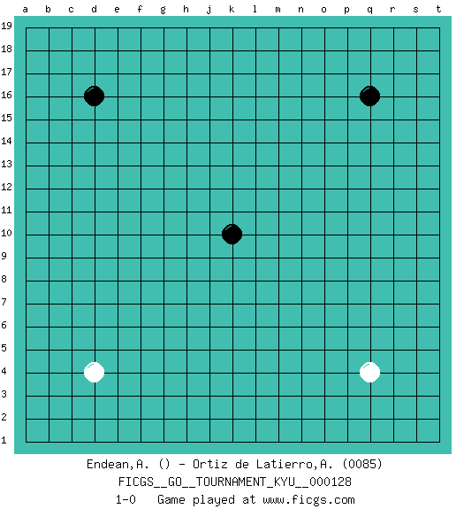 Last move : 1-0 2011 October 26 12:49:49 [Event "FICGS__GO__TOURNAMENT_KYU__000128"] [Site "FICGS"] [Date "2011.09.23"] [Round "1"] [Black "Endean,Andrew"] [White "Ortiz de Latierro,Aitor"] [Result "1-0"] [Rating 2 "0085"] 1.k10 d4 2.q16 q4 3.d16 1-0 This go game has been lost on time (started : 2011.09.23 13:43:46) Here are the names of the openings (joseki) played in the four corners : Player Black won this Go (weiqi, baduk) game. Follow this game move after move (download)Don't try to enclose an open skirt. (Anonymous) See no evil, hear no evil, speak no evil. (The 3 monkeys)