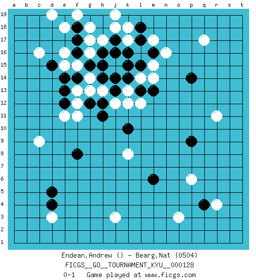 Last move : 0-1 2011 October 7 19:4:10 [Event "FICGS__GO__TOURNAMENT_KYU__000128"] [Site "FICGS"] [Date "2011.09.23"] [Round "1"] [Black "Endean,Andrew"] [White "Bearg,Nat"] [Result "0-1"] [Rating 2 "0504"] 1.k10 q17 2.d4 c16 3.d5 r4 4.q4 r11 5.e14 j3 6.k16 c9 7.p14 k8 8.m6 k13 9.p9 f11 10.f8 h17 11.h16 k17 12.j17 j18 13.j16 o3 14.k14 p6 15.k15 d3 16.j14 g13 17.h14 g14 18.h15 l14 19.l15 m15 20.m16 m14 21.l17 k18 22.h18 g17 23.l18 g18 24.g19 f19 25.h19 n16 26.j13 j12 27.g15 f15 28.f16 g16 29.f14 e15 30.f17 j19 31.f18 e18 32.e19 d19 33.g12 f13 34.e13 f12 35.e12 e11 36.d15 e16 37.l13 k12 38.h12 h13 39.h11 l12 40.m13 m17 0-1 Comment by player 1 : Andrew Endean : just when i think i am getting the hang of it i make a stupid move, but enjoying the game Comment by player 2 : Nat Bearg : Fun :) Here are the names of the openings (joseki) played in the four corners : Corner q4 : r4 q4 Komoku (Somok, Xiao~mu`) 3-4 Point. The komoku (3-4) point is the traditional corner enclosure move.. Corner d16 : c16 e14 Komoku (Somok, Xiao~mu`) 3-4 Point. The komoku (3-4) point is the traditional corner enclosure move.. Player White won this Go (weiqi, baduk) game. Follow this game move after move (download)One point in the center is worth ten in the corner. (Anonymous) The only thing that overcomes hard luck is hard work. (Harry Golden)