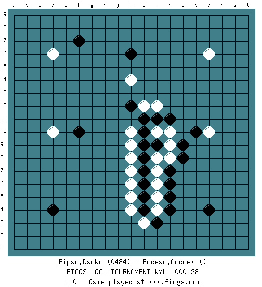 Last move : 1-0 2011 October 5 18:50:47 [Event "FICGS__GO__TOURNAMENT_KYU__000128"] [Site "FICGS"] [Date "2011.09.23"] [Round "1"] [Black "Pipac,Darko"] [White "Endean,Andrew"] [Result "1-0"] [Rating 1 "0484"] 1.d4 q16 2.q4 d16 3.f17 d10 4.k16 k4 5.f10 q10 6.p10 k14 7.k12 k10 8.l10 m10 9.l11 l12 10.m11 m12 11.l9 k9 12.l8 k8 13.l7 k7 14.l6 k6 15.l5 k5 16.l4 l3 17.m3 m4 18.n4 m5 19.n5 m6 20.n6 m7 21.n7 m8 22.m9 n8 23.o8 n9 24.o9 n10 25.n11 1-0 Here are the names of the openings (joseki) played in the four corners : Corner d16 : d16 f17 Hoshi (Hwajeom, Seongjeom, Xingwei`) 4-4 Point. The star or hoshi (4-4) point, emphasizing influence at the potential expense of territory. Ikken Kakari (Hankan Keolch'im, Yi Gua`jiao~, 1-Space Low Approach). Black 2 is the standard approach move to the 4-4. Corner q16 : q16 l11 Hoshi (Hwajeom, Seongjeom, Xingwei`) 4-4 Point. The star or hoshi (4-4) point, emphasizing influence at the potential expense of territory. Player Black won this Go (weiqi, baduk) game. Follow this game move after move (download)I really believe that Go is destined to take the place of Chess as the leading intellectual game of the Occident, just as it has reigned supreme in the Orient for some four thousand years. (Edward Lasker, international chess master) A person who never made a mistake never tried anything new. (Albert Einstein)