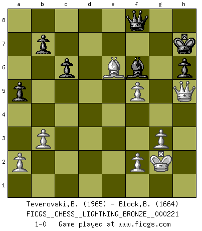 Last move : 1-0 2011 September 23 19:23:23 [Event "FICGS__CHESS__LIGHTNING_BRONZE__000221"] [Site "FICGS"] [Date "2011.09.23"] [Round "1"] [White "Teverovski,Bogoljub"] [Black "Block,Benjamin"] [Result "1-0"] [WhiteElo "1965"] [BlackElo "1664"] 1.d4 d5 2.c4 c6 3.Nf3 Nf6 4.Nc3 e6 5.Bg5 h6 6.Bxf6 Qxf6 7.e3 Nd7 8.Qc2 g6 9.Bd3 dxc4 10.Bxc4 Bg7 11.O-O O-O 12.Ne4 Qe7 13.Bb3 e5 14.Ng3 Kh8 15.Rfe1 f5 16.e4 f4 17.Ne2 g5 18.Rad1 g4 19.Nxe5 Nxe5 20.dxe5 Bxe5 21.Nd4 f3 22.g3 Qg7 23.Qc5 Re8 24.Re3 Qe7 25.Qc4 Qg7 26.Qc5 Qe7 27.Qa5 Qg7 28.Nf5 Bxf5 29.exf5 Bf6 30.Qe1 Rxe3 31.Qxe3 Qg5 32.Qe4 Qg7 33.h3 gxh3 34.Kh2 a5 35.Be6 Rd8 36.Rxd8+ Bxd8 37.Kxh3 Bf6 38.b3 Qg5 39.Qxf3 Kh7 40.Bc8 Qg7 41.Kg2 Qf7 42.Be6 Qf8 43.Qh5 1-0 QGD Slav : 4.Nc3 Kingside Castling by player White (move 11) Kingside Castling by player Black (move 11) Player White won this chess game. Follow this game move after move (download)I look one move ahead... the best ! (Siegbert Tarrasch) Alles was ich jemals tun will ist Schach spielen. (Robert James Fischer) Por la belleza de sus partidas, la claridad de su juego y lo brillante de sus ideas, Fischer se creó el mismo como un artista de la misma estatura como Brahms, Rembrandt y Shakespeare. (David Levy) Aucun coup ne doit être joué sans but. (Pedro Damiano) The beginning is the most important part of the work. (Plato)