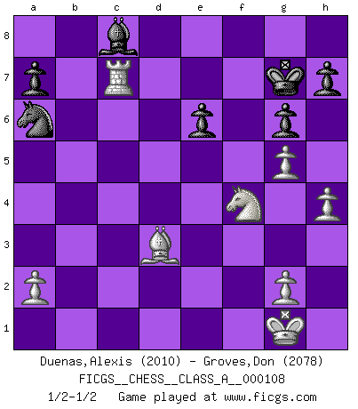 Last move : 1/2-1/2 2011 October 4 8:6:6 [Event "FICGS__CHESS__CLASS_A__000108"] [Site "FICGS"] [Date "2011.09.23"] [Round "1"] [White "Duenas,Alexis"] [Black "Groves,Don"] [Result "1/2-1/2"] [WhiteElo "2010"] [BlackElo "2078"] 1.d4 Nf6 2.c4 g6 3.Nc3 d5 4.cxd5 Nxd5 5.e4 Nxc3 6.bxc3 Bg7 7.Bc4 c5 8.Ne2 Nc6 9.Be3 O-O 10.O-O Qc7 11.Rc1 Rd8 12.Bf4 Be5 13.Bg3 Bxg3 14.fxg3 e6 15.Qd2 Rb8 16.Rf2 b5 17.Bb3 c4 18.Bc2 b4 19.Rcf1 bxc3 20.Qxc3 Rd7 21.Ba4 Re7 22.Qxc4 Na5 23.Qxc7 Rxc7 24.d5 Ba6 25.dxe6 fxe6 26.Rd1 Rb4 27.Nf4 Rxe4 28.h4 Bc8 29.Bb5 Kg7 30.Bd3 Re5 31.g4 Rec5 32.Ba6 Nb7 33.g5 R5c6 34.Bd3 Rc1 35.R2f1 Rxd1 36.Rxd1 Nc5 37.Rc1 Na6 38.Rxc7+ 1/2-1/2 King's Indian defense, 3.Nc3 Kingside Castling by player Black (move 9) Kingside Castling by player White (move 10) This chess game ended in a draw. Follow this game move after move (download)The tactician must know what to do whenever something needs doing; the strategist must know what to do when nothing needs doing. (Savielly Tartakover) Schach ist Leben. (Robert James Fischer) Aquel que teme a un Peón de Reina aislado, debería de retirarse del Ajedrez. (Siegbert Tarrasch) Mais n'est-ce pas déjà le limiter injurieusement que d'appeler les échecs un jeu? N'est-ce pas aussi une science, un art, ou quelque chose qui, comme le cercueil de Mahomet entre ciel et terre, est suspendu entre l'un et l'autre, et qui réunit un nombre incroyable de contraires ? (Stefan Zweig) Hello Thibault, if I have had a plan (and I had one, I hope), I have forgotten it during the last week... - Hello Heinz-Georg. What do you mean a plan ? (Anonymous players, during a Big Chess game)