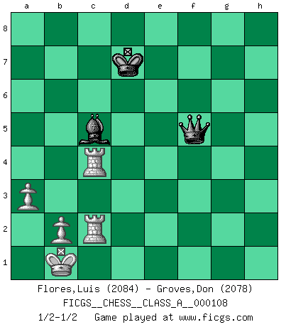 Last move : 1/2-1/2 2011 December 28 6:42:8 [Event "FICGS__CHESS__CLASS_A__000108"] [Site "FICGS"] [Date "2011.09.23"] [Round "1"] [White "Flores,Luis"] [Black "Groves,Don"] [Result "1/2-1/2"] [WhiteElo "2084"] [BlackElo "2078"] 1.d4 Nf6 2.Bg5 d5 3.Bxf6 exf6 4.e3 c5 5.Ne2 Be6 6.Qd2 Nc6 7.Nbc3 cxd4 8.Nxd4 Be7 9.O-O-O O-O 10.Nce2 Qb6 11.Nf4 Rac8 12.c3 Nxd4 13.Qxd4 Qa5 14.Kb1 Rfd8 15.Qd3 Rc6 16.Qc2 Rdc8 17.Rd4 Rb6 18.Ka1 Bb4 19.Ne2 Ra6 20.Qb3 Bc5 21.Nf4 Rd6 22.Nxe6 fxe6 23.Rh4 f5 24.Bd3 Rdc6 25.Rc1 a6 26.g4 Be7 27.Rh3 Bf6 28.Qxb7 Rxc3 29.Qxc8+ Rxc8 30.Rxc8+ Kf7 31.Rb8 fxg4 32.Rb7+ Be7 33.Rxh7 Qe1+ 34.Bb1 Qxf2 35.Rh8 Qxe3 36.Rc8 Kf6 37.R8c7 Bc5 38.Rxg7 Qh3 39.Rg6+ Ke5 40.Rbg7 Qxh2 41.Rxg4 a5 42.Rb7 Kd6 43.a3 Qe2 44.R4g7 Ke5 45.Rg5+ Kf4 46.Rg8 Bd4 47.Rf8+ Ke5 48.Ra8 Kd6 49.Rxa5 e5 50.Rb4 Qd2 51.Ra6+ Kc7 52.Bg6 Qe2 53.Rf6 Qd1+ 54.Ka2 e4 55.Rf5 Bc5 56.Rb3 e3 57.Bh5 e2 58.Bxe2 Qxe2 59.Rxd5 Bf8 60.Rc3+ Kb6 61.Rd8 Bc5 62.Rb8+ Kc7 63.Rb4 Qe6+ 64.Kb1 Qf5+ 65.Rc2 Kd7 66.Rbc4 1/2-1/2 Trompowsky attack (Ruth, Opovcensky Opening) Queenside Castling by player White (move 9) Kingside Castling by player Black (move 9) 10 pieces endgame at move 58 : White KRRBPP , Black KQBP WHITE : King + 2 Rooks 1 Bishop 2 Pawns BLACK : King + 1 Queen 1 Bishop 1 Pawn 9 pieces endgame at move 58 : White KRRPP , Black KQBP WHITE : King + 2 Rooks 2 Pawns BLACK : King + 1 Queen 1 Bishop 1 Pawn 8 pieces endgame at move 59 : White KRRPP , Black KQB WHITE : King + 2 Rooks 2 Pawns BLACK : King + 1 Queen 1 Bishop This chess game ended in a draw. Follow this game move after move (download)It was clear to me that the vulnerable point of the American Grandmaster (Bobby Fischer) was in double-edged, hanging, irrational positions, where he often failed to find a win even in a won position. (Efim Geller) Fischer ist das größte Genie, das je vom Schachhimmel heruntergestiegen ist. (Mikhail Nekhemyevich Tal) El Peón aislado arroja penumbra sobre todo el tablero. (Aaron Nimzovich) Les écrivains ont utilisé les échecs pour analyser les côtés extrêmes de la nature humaine. Dans ce cadre, les échecs offrent un champ d'expérimentation idéal. Mais on pourrait faire la même chose avec la peinture. Et là, en vous référant à Van Gogh, vous ne tirerez pas de conclusion définitive sur les peintres. (Gary Kasparov) Chess, like love, like music, has the power to make people happy. (Siegbert Tarrasch)