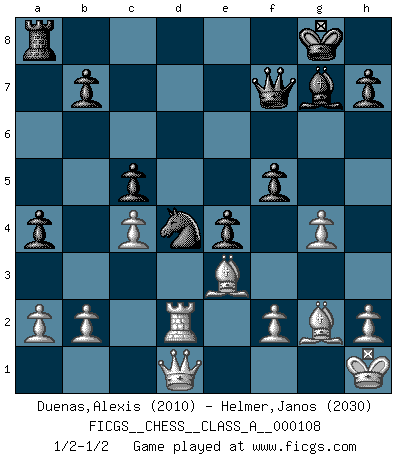 Last move : 1/2-1/2 2012 January 7 18:13:6 [Event "FICGS__CHESS__CLASS_A__000108"] [Site "FICGS"] [Date "2011.09.23"] [Round "1"] [White "Duenas,Alexis"] [Black "Helmer,Janos"] [Result "1/2-1/2"] [WhiteElo "2010"] [BlackElo "2030"] 1.d4 Nf6 2.c4 d6 3.Nc3 Nbd7 4.Nf3 e5 5.e3 g6 6.dxe5 dxe5 7.Be2 Bg7 8.e4 O-O 9.O-O c6 10.Be3 Qe7 11.Qc2 Nh5 12.g3 Nc5 13.Rfd1 Bg4 14.Rd2 Rfd8 15.Rad1 Rxd2 16.Rxd2 Ne6 17.Qa4 Nhf4 18.Bd1 Bxf3 19.Bxf3 Nd4 20.Bg2 Nfe6 21.Ne2 a5 22.Nc1 f5 23.exf5 gxf5 24.Qd1 Qb4 25.Bf1 a4 26.Nd3 Qe7 27.Bg2 e4 28.Ne1 c5 29.Kh1 Bf6 30.Nc2 Nxc2 31.Qxc2 Nd4 32.Qd1 Qf7 33.g4 Bg7 1/2-1/2 Old Indian defense Kingside Castling by player Black (move 8) Kingside Castling by player White (move 9) This chess game ended in a draw. Follow this game move after move (download)By the beauty of his games, the clarity of his play, and the brilliance of his ideas, Fischer made himself an artist of the same stature as Brahms, Rembrandt, and Shakespeare. (David Levy) Wir können eben der zündenden Macht des Opfers nicht wiederstehen, denn die Begeisterung für das Opfer liegt in der Natur des Menschen. (Rudolf Spielmann) Cualquier cambio de material en una posición debe venir por medio de un mate, una captura o promoción de Peón. (Purdy) Toute estimation doit être constamment réévaluée. (Jacob Estrin) My poor ole parrot... Is not in the circulation of displays ....poo hoo hoo :) (Wayne Lowrance's enigma)