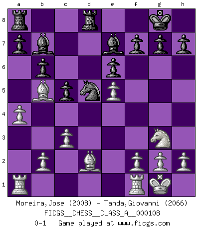 Last move : 0-1 2012 February 20 19:51:5 [Event "FICGS__CHESS__CLASS_A__000108"] [Site "FICGS"] [Date "2011.09.23"] [Round "1"] [White "Moreira,Jose"] [Black "Tanda,Giovanni"] [Result "0-1"] [WhiteElo "2008"] [BlackElo "2066"] 1.e4 c6 2.d4 d5 3.Nc3 dxe4 4.Nxe4 Nd7 5.Nf3 Ngf6 6.Ng3 e6 7.a4 c5 8.c3 Be7 9.Be3 b6 10.Bb5 Bb7 11.O-O O-O 12.Ne5 Nxe5 13.dxe5 Qd5 14.Qxd5 Nxd5 15.Bd2 Rfd8 0-1 This chess game has been lost on time (started : 2011.09.23 18:36:50) Caro-Kann : Steinitz variation Kingside Castling by player White (move 11) Kingside Castling by player Black (move 11) Player Black won this chess game. Follow this game move after move (download)Chess is life. (Bobby Fischer) Ich suche im Schach immer etwas Eigenes. Riskantes Spiel im Stile schachlicher Musketiere ist nicht meine Sache, auch wenn es vielen Freunden scharfer Wendungen gefällt. (Anatoly Karpov) Si yo gano un torneo, yo lo gano por mí mismo. Yo hago las jugadas. Nadie me ayuda. (Bobby Fischer) Fischer est le meilleur joueur du monde et Karpov n'est qu'un joueur de bistrot. (Garry Kasparov, agé de 16 ans) A good book on your shelf is a friend that turns its back on you and remains a friend. (Author unknown)