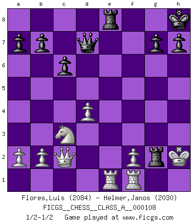 Last move : 1/2-1/2 2012 March 13 10:48:28 [Event "FICGS__CHESS__CLASS_A__000108"] [Site "FICGS"] [Date "2011.09.23"] [Round "1"] [White "Flores,Luis"] [Black "Helmer,Janos"] [Result "1/2-1/2"] [WhiteElo "2084"] [BlackElo "2030"] 1.d4 Nf6 2.Bg5 d5 3.Bxf6 exf6 4.e3 Be6 5.Ne2 Bd6 6.Qd2 f5 7.Nf4 O-O 8.Nxe6 fxe6 9.c4 c6 10.Be2 Nd7 11.O-O Nf6 12.Nc3 Qe7 13.Rac1 Kh8 14.Qc2 dxc4 15.Bxc4 Bxh2+ 16.Kxh2 Ng4+ 17.Kg3 e5 18.Be2 exd4 19.exd4 Rae8 20.Bxg4 fxg4 21.Kxg4 Rf6 22.Rce1 Qd7+ 23.Kg3 Rg6+ 24.Kh2 Rxg2+ 1/2-1/2 Trompowsky attack (Ruth, Opovcensky Opening) Kingside Castling by player Black (move 7) Kingside Castling by player White (move 11) This chess game ended in a draw. Follow this game move after move (download)I like the moment when I break a man's ego. (Bobby Fischer) Unter Putin wird alles Geld aus Russland wie von einem Staubsauger nach Moskau umgeleitet, das ist wie ein schwarzes Loch. (Garry Kasparov) El Peón aislado arroja penumbra sobre todo el tablero. (Aaron Nimzovich) Avec des compensations pour le matériel en plus... (Anonyme) Control your own destiny or someone else will. (Jack Welch)