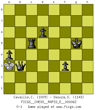Last move : 0-1 2011 November 19 17:33:32 [Event "FICGS__CHESS__RAPID_E__000062"] [Site "FICGS"] [Date "2011.09.23"] [Round "1"] [White "Cavaille,Cedric"] [Black "Dsouza,Stanislaus"] [Result "0-1"] [WhiteElo "1009"] [BlackElo "1143"] 1.e4 e5 2.Nf3 Nc6 3.Bc4 h6 4.a3 Nf6 5.d3 d6 6.O-O Be7 7.b4 O-O 8.Nc3 Nh7 9.b5 Na5 10.Ba2 Ng5 11.Nxg5 Bxg5 12.Bxg5 Qxg5 13.Qc1 c6 14.Qxg5 hxg5 15.bxc6 Nxc6 16.Nd5 Be6 17.g3 Rac8 18.Rab1 Bxd5 19.Bxd5 b6 20.f4 gxf4 21.gxf4 exf4 22.Rxf4 Nd4 23.c4 Ne2+ 24.Kf2 Nxf4 25.Ke3 Nxd5+ 26.exd5 Rfe8+ 27.Kd4 Re2 28.h4 Rh2 29.Re1 Rxh4+ 30.Re4 Rxe4+ 31.Kxe4 g6 32.Kd4 Kg7 33.a4 f5 34.c5 bxc5+ 35.Kc4 g5 36.d4 cxd4 37.Kxd4 g4 38.Ke3 Kg6 39.Kf4 Rc4+ 40.Kg3 Kg5 41.a5 f4+ 42.Kf2 Ra4 43.Ke2 Rxa5 44.Kd3 Rxd5+ 45.Kc4 Re5 46.Kd4 g3 47.Kd3 f3 48.Kd4 a5 49.Kc4 g2 50.Kd4 g1Q+ 51.Kc4 Qd1 52.Kc3 Rc5+ 53.Kb2 a4 54.Ka3 Qb3+ 0-1 King's pawn game Kingside Castling by player White (move 6) Kingside Castling by player Black (move 7) 10 pieces endgame at move 36 : White KPP , Black KRPPPPP WHITE : King + 2 Pawns BLACK : King + 1 Rook 5 Pawns 9 pieces endgame at move 37 : White KPP , Black KRPPPP WHITE : King + 2 Pawns BLACK : King + 1 Rook 4 Pawns 8 pieces endgame at move 43 : White KP , Black KRPPPP WHITE : King + 1 Pawn BLACK : King + 1 Rook 4 Pawns 7 pieces endgame at move 44 : White K , Black KRPPPP WHITE : King + BLACK : King + 1 Rook 4 Pawns Promotion Queen by player Black (move 50) Player Black won this chess game. Follow this game move after move (download)Whoever sees no other aim in the game than that of giving checkmate to one's opponent will never become a good Chess player. (Euwe) Die Leute spielen gegen mich seit 15 Jahren unter Ihren Möglichkeiten. (Robert James Fischer) Si no le temes a Spassky, entonces elimino el elemento del dinero. (Jim Slater) Que feriez-vous si vous étiez en train de jouer aux échecs et que la fin du monde arrive ? Je continuerais à jouer. (Saint Borromée) The obstacle is the path. (Zen proverb)