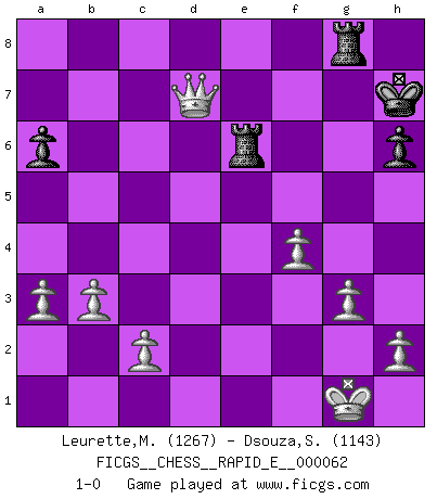 Last move : 1-0 2011 October 27 14:29:22 [Event "FICGS__CHESS__RAPID_E__000062"] [Site "FICGS"] [Date "2011.09.23"] [Round "1"] [White "Leurette,Marc-Antoine"] [Black "Dsouza,Stanislaus"] [Result "1-0"] [WhiteElo "1267"] [BlackElo "1143"] 1.e4 c5 2.Nc3 Nc6 3.Nf3 d6 4.Bb5 a6 5.Bxc6+ bxc6 6.O-O e6 7.d4 cxd4 8.Qxd4 Nf6 9.Bg5 h6 10.Bxf6 gxf6 11.b3 Rg8 12.Rad1 e5 13.Qc4 Bd7 14.a3 Qb6 15.Rfe1 Be6 16.Qb4 Qc7 17.Qa4 Ke7 18.Rd3 f5 19.Nd5+ cxd5 20.exd5 Bd7 21.Qh4+ Ke8 22.Rd2 Rg6 23.Rde2 f4 24.Nxe5 dxe5 25.Rxe5+ Be6 26.Qxf4 Bd6 27.dxe6 Bxe5 28.exf7+ Kf8 29.Rxe5 Qxf7 30.Rf5 Qxf5 31.Qxf5+ Kg7 32.Qd7+ Kh8 33.Qd4+ Kh7 34.f4 Rag8 35.Qd3 Kh8 36.g3 Re6 37.Qd4+ Kh7 38.Qd7+ 1-0 Sicilian : Closed, 2...Nc6 Kingside Castling by player White (move 6) Player White won this chess game. Follow this game move after move (download)The Pin is mightier than the sword. (Fred Reinfeld) Du musst Deinen Gegner in einen tiefen dunklen Wald führen wo 2+2=5 ist und wo der Weg, der wieder hinausführt, nur breit genug für einen ist. (Mikhail Nekhemyevich Tal) Tu puedes aprender mucho mas de una partida que pierdas que de una partida ganada. Tendras que perder cientos de partidas antes de llegar a ser un buen jugador. (Jose Raul Capablanca) La vie et les Echecs sont tous les deux une lutte constante. (Lasker) Internet: Absolute communication, absolute isolation. (Paul Carvel)